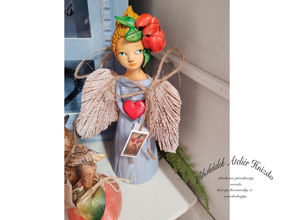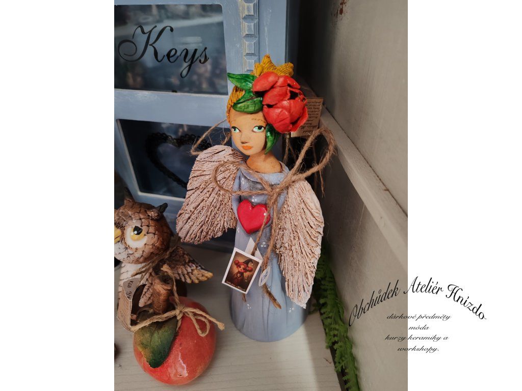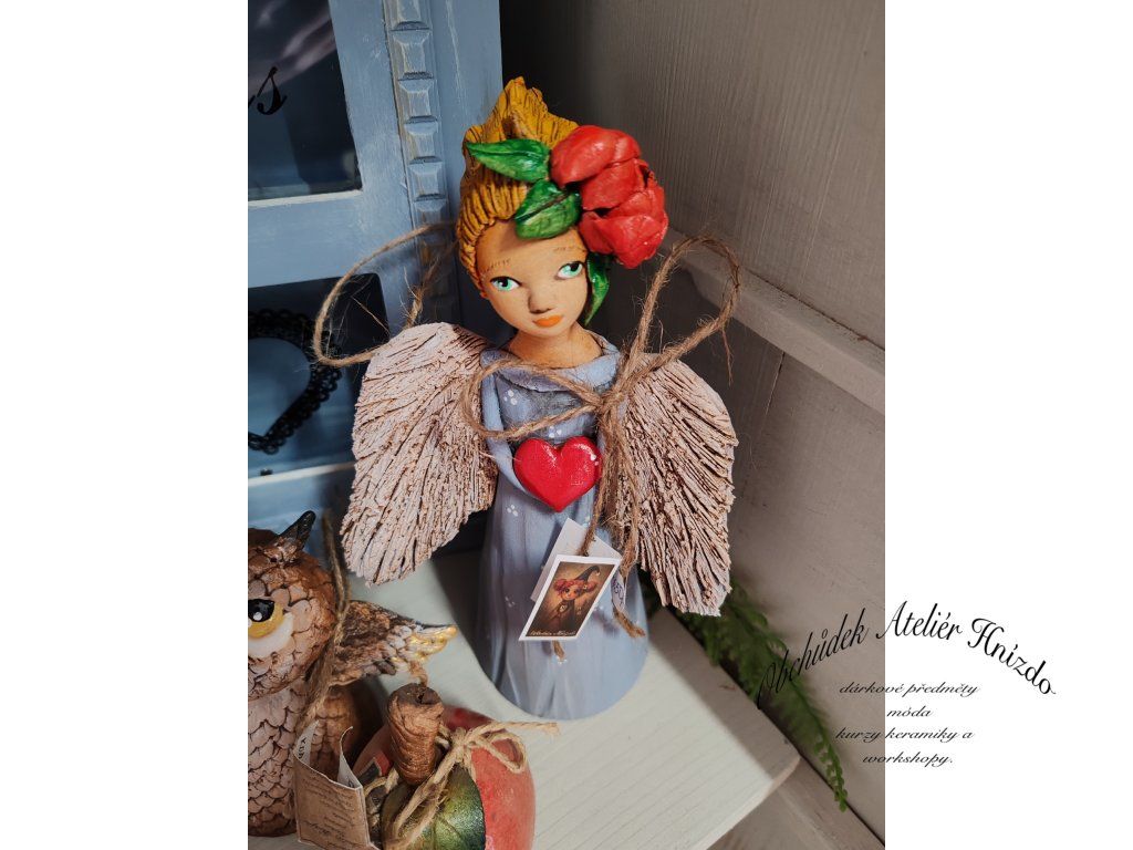 Ručně vyráběná keramická postavička něžného anděla s jemným výrazem a srdcem na hrudi.