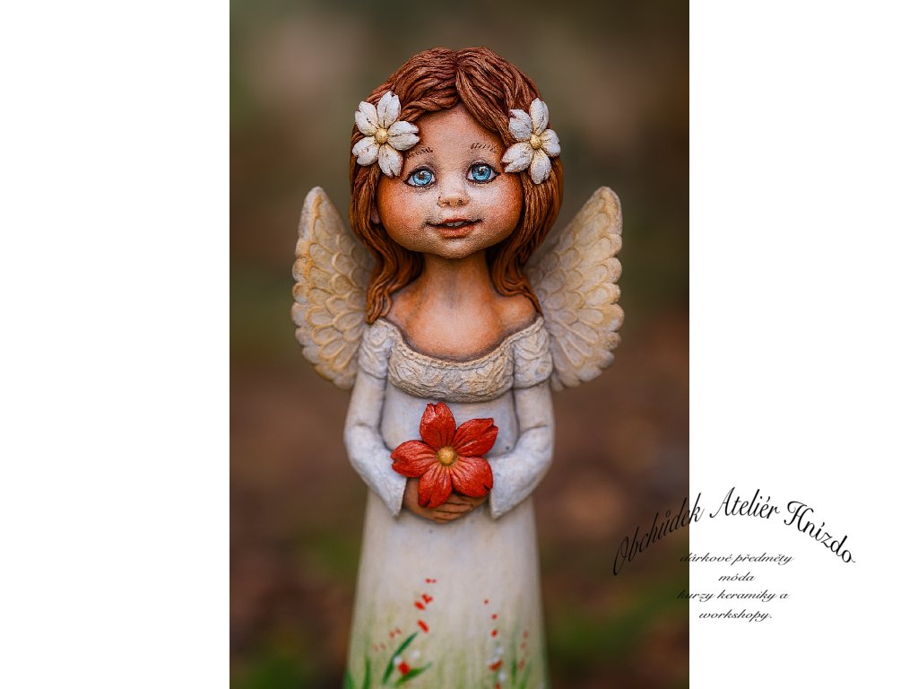 Malá ochránkyně jarních květin a dětských přání, s očima modrýma jako nebe a kvítky ve vlasech. V náručí drží rudý květ a na šatech jí rozkvetla letní louka. Tato andělská bytůstka v sobě nese otisk ruční práce, radosti z tvoření a kouzlo pohádek, které žijí u nás ve skřítkově.