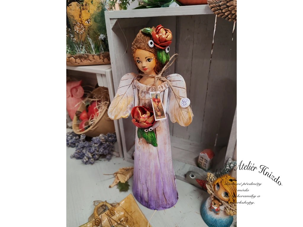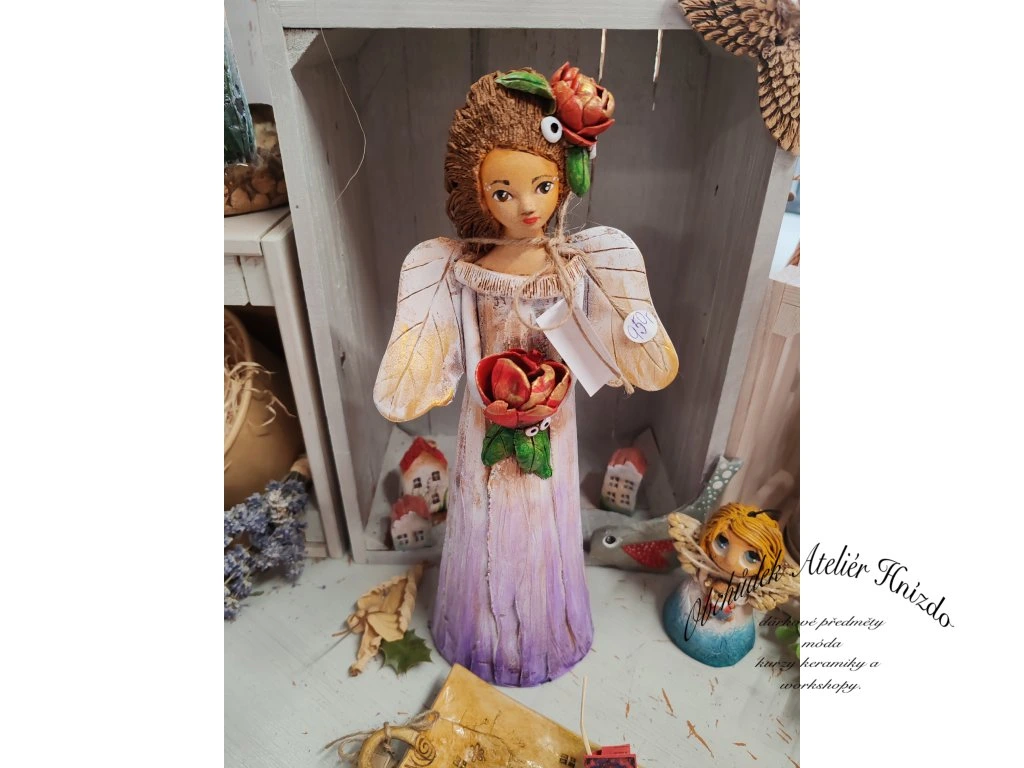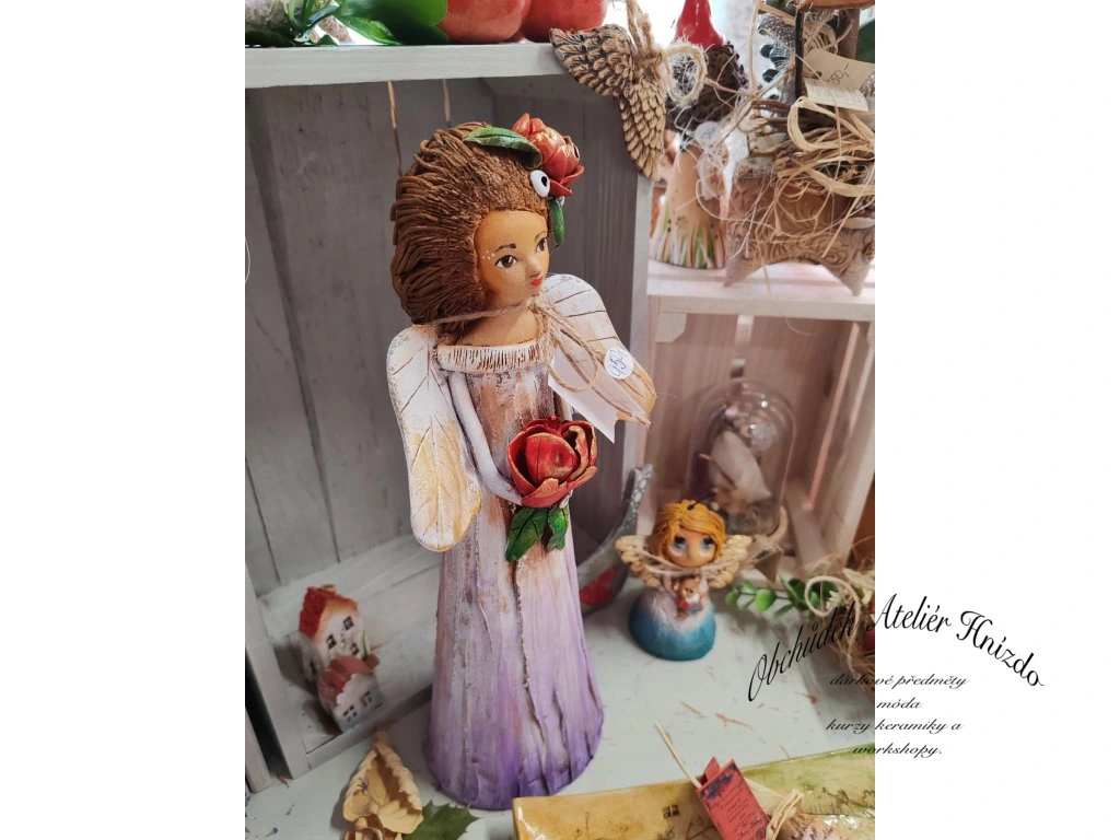 Ručně vyráběná keramická postavička něžného anděla s výrazným květem v rukou a jemným, klidným výrazem.