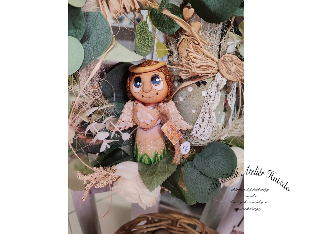 Křehká bytost s jemnými křídly a zlatou svatozáří drží ruce na srdíčku, jako by tiše přinášela klid, ochranu a lásku. Působí velmi něžně a harmonicky, jako malý strážný anděl, který bdí nad domovem.