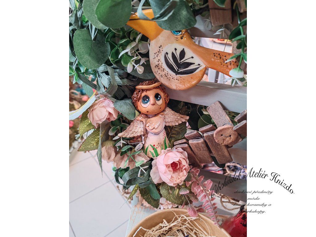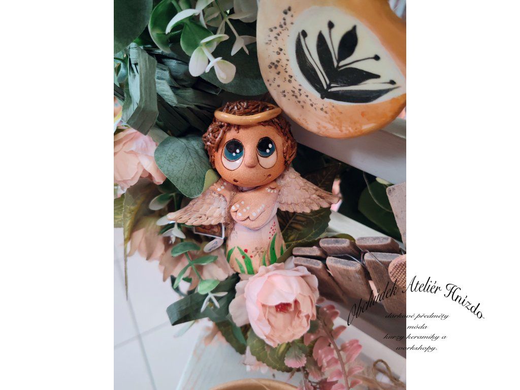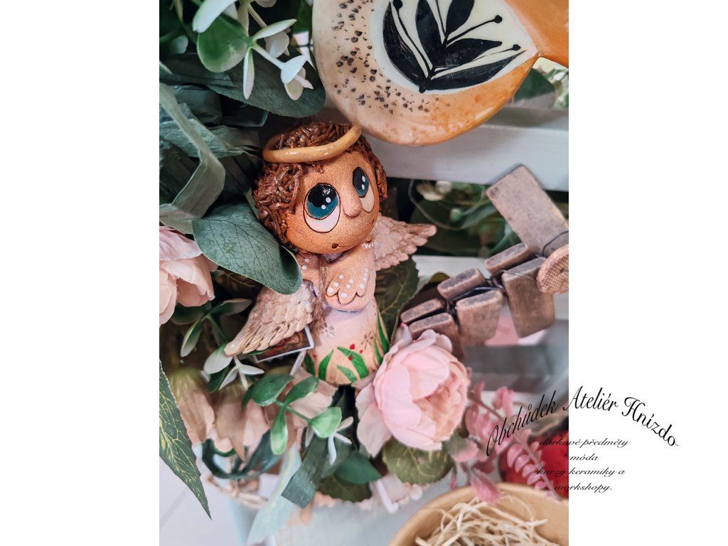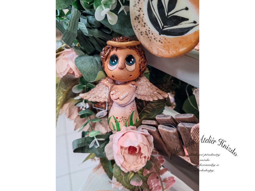 Křehká bytost s jemnými křídly a zlatou svatozáří drží ruce na srdíčku, jako by tiše přinášela klid, ochranu a lásku. Působí velmi něžně a harmonicky, jako malý strážný anděl, který bdí nad domovem.