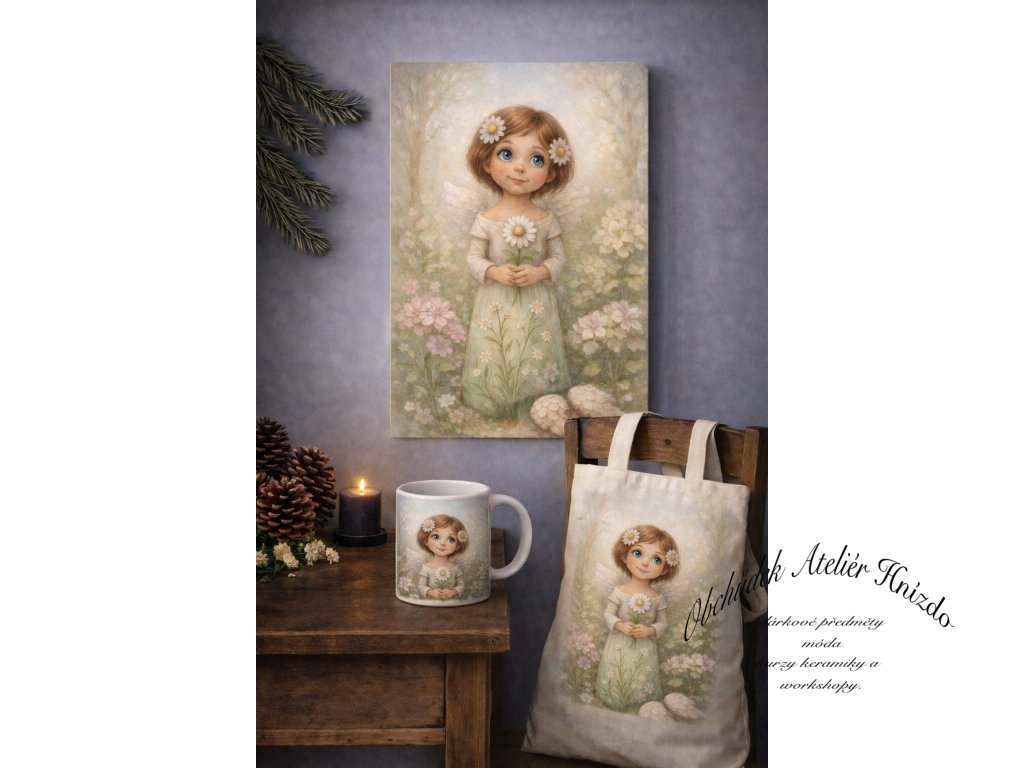 Nádherný motiv andělky s něžnou květinou navozuje pocit souznění a harmonie. Obraz je laděn do teplých tónů a hodí se do interiéru, dětského pokoje nebo jako něžný dárek.