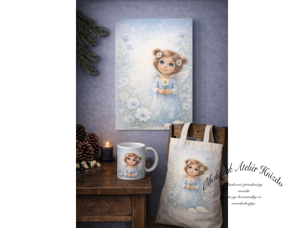 Nádherný motiv andělky s něžnou květinou navozuje pocit souznění a harmonie. Obraz je laděn do teplých tónů a hodí se do interiéru, dětského pokoje nebo jako něžný dárek.