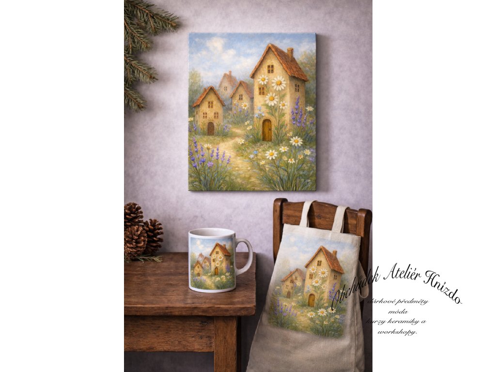 Mezi domečky vede klikatá cesta obklopená kopretinami, levandulí a lučními květy. Obraz v sobě nese pocit bezpečí, zpomalení a návratu „tam, kde je dobře“. Každý dům působí, jako by měl vlastní příběh a čekal na svého obyvatele.