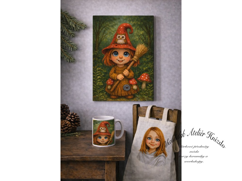 Motiv lesní čarodějky s košťátkem a malou sovičkou v klobouku symbolizuje ochranu, moudrost a tiché propojení s přírodou. Obraz působí hřejivě, klidně a hravě – jako laskavý strážce lesa, který přináší pocit bezpečí a fantazie do každého interiéru.