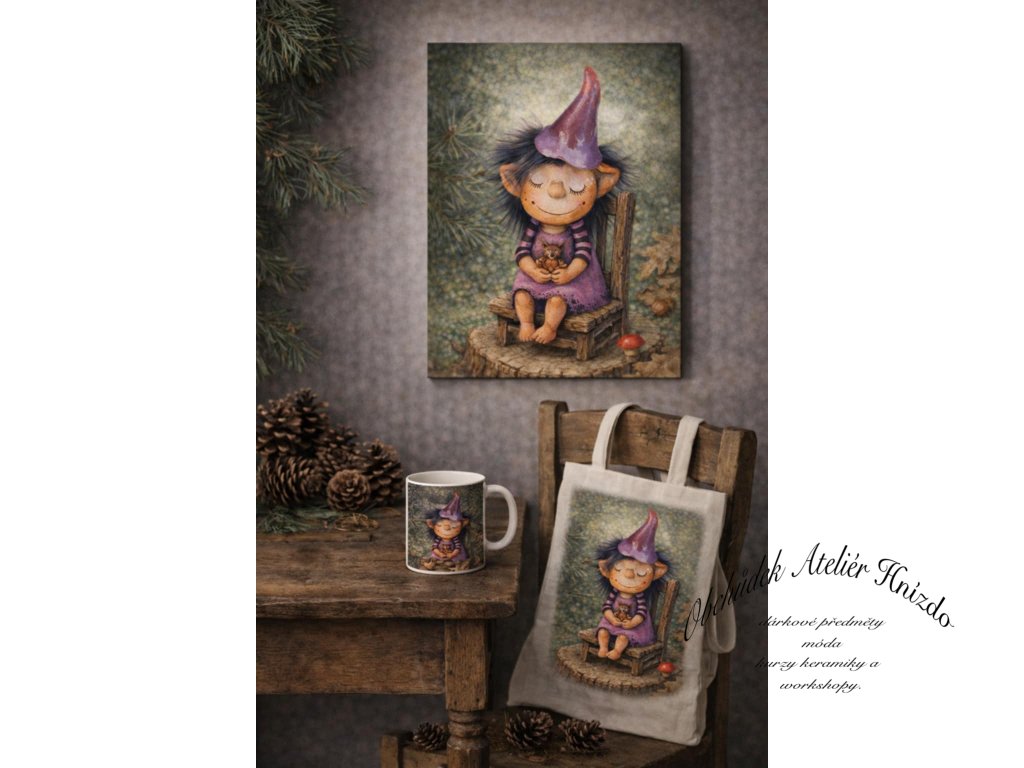 Motiv malého lesního skřítka, opatrovnice lesních zvířátek, rostlinek navodí atmosféru útulného domova. Obraz je laděn do teplých tónů a hodí se do interiéru, dětského pokoje nebo jako něžný dárek.