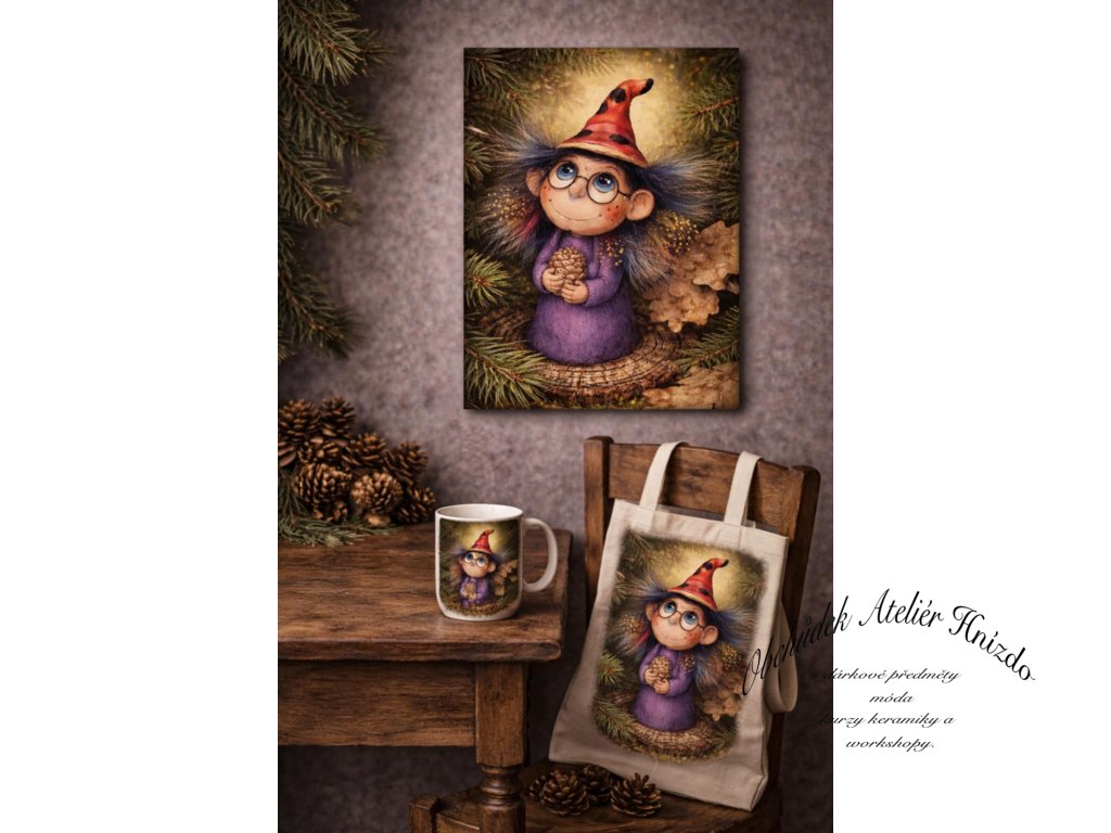 Motiv malého lesního skřítka symbolizuje ochranu, klid a světlo na cestě – v lese i v životě. Obraz je laděn do teplých podzimních tónů a hodí se do interiéru, dětského pokoje nebo jako něžný dárek.