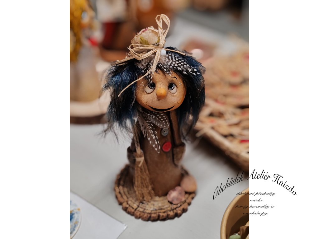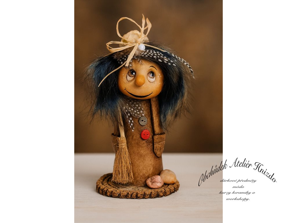 Roztomilá skřítek–čarodějka, která jako by právě vyšla z lesa. Přináší s sebou dobrou náladu, hravost a špetku kouzel. Její pestrobarevné vlásky, malé košťátko a ručně malované detaily vytvářejí jedinečný charakter, který ozdobí každý domov. Každý kus je ručně modelovaný originál z Ateliéru Hnízdo.