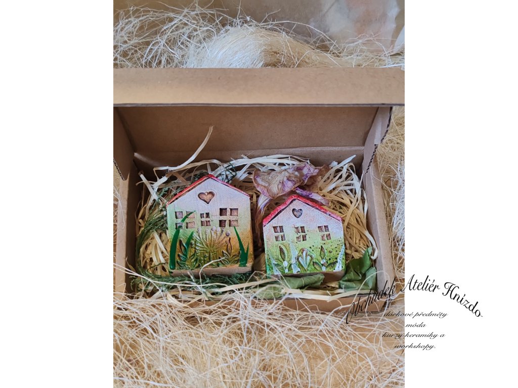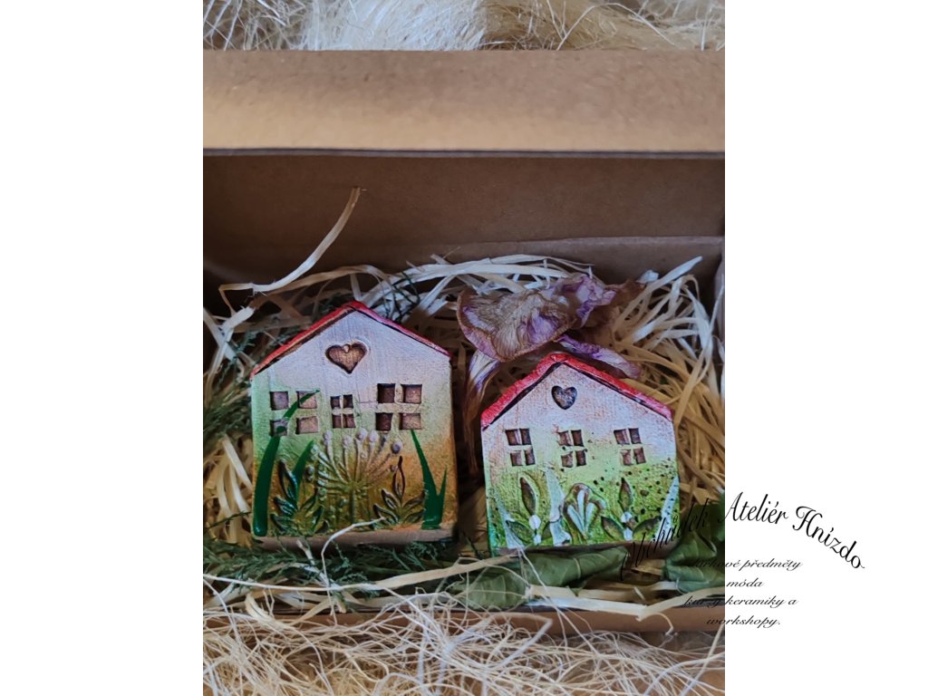 Originální sada dvou keramických domečků od Romany Laštovičkové, uložená v přírodní dárkové krabičce. Každý domeček je ručně modelovaný, pálený na vysokou teplotu (1200 °C), dekorovaný glazurami z Roudnice, oxidem železa a domalovaný barvami Darwi. Díky tomu jsou domečky pevné, odolné a vhodné jak do interiéru, tak i ven – snesou déšť i mráz.