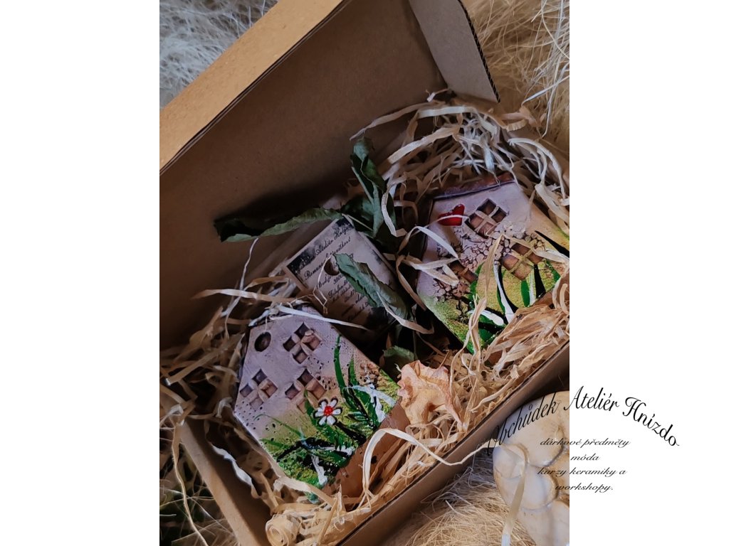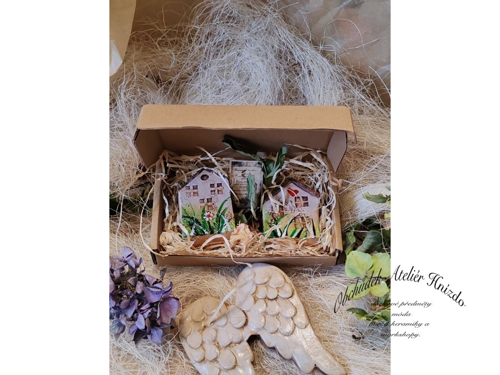 Originální sada dvou keramických domečků od Romany Laštovičkové, uložená v přírodní dárkové krabičce. Každý domeček je ručně modelovaný, pálený na vysokou teplotu (1200 °C), dekorovaný glazurami z Roudnice, oxidem železa a domalovaný barvami Darwi. Díky tomu jsou domečky pevné, odolné a vhodné jak do interiéru, tak i ven – snesou déšť i mráz.