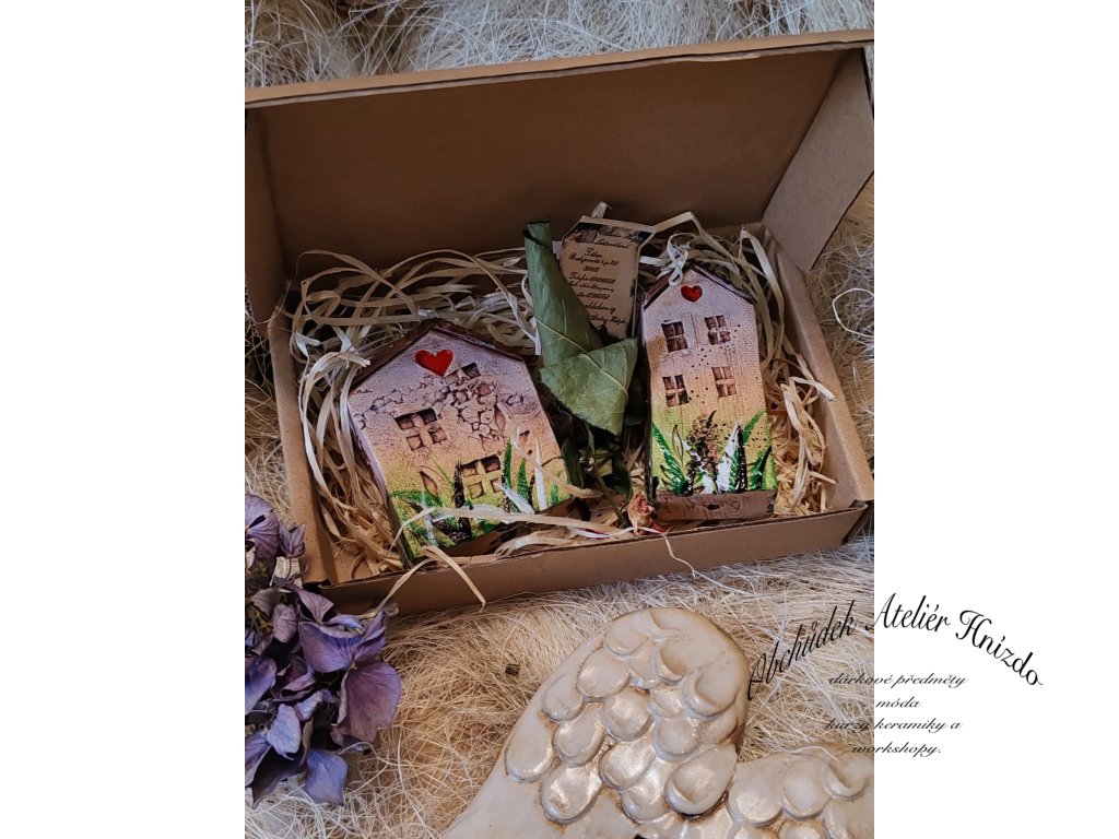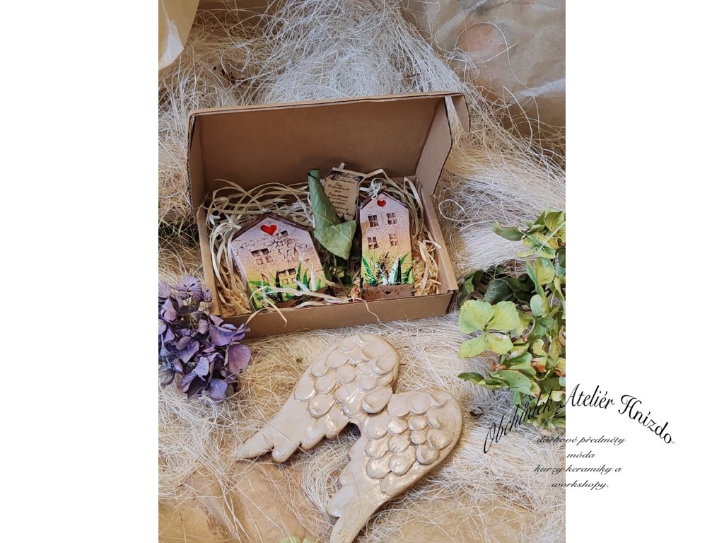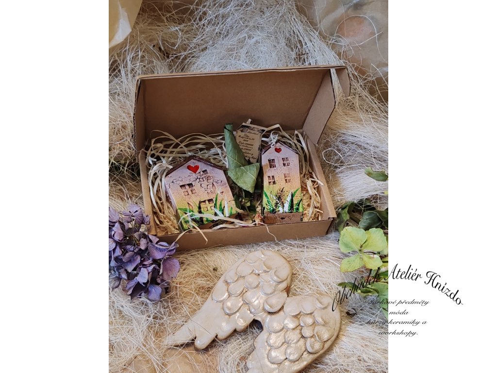 Originální sada dvou keramických domečků od Romany Laštovičkové, uložená v přírodní dárkové krabičce. Každý domeček je ručně modelovaný, pálený na vysokou teplotu (1200 °C), dekorovaný glazurami z Roudnice, oxidem železa a domalovaný barvami Darwi. Díky tomu jsou domečky pevné, odolné a vhodné jak do interiéru, tak i ven – snesou déšť i mráz.