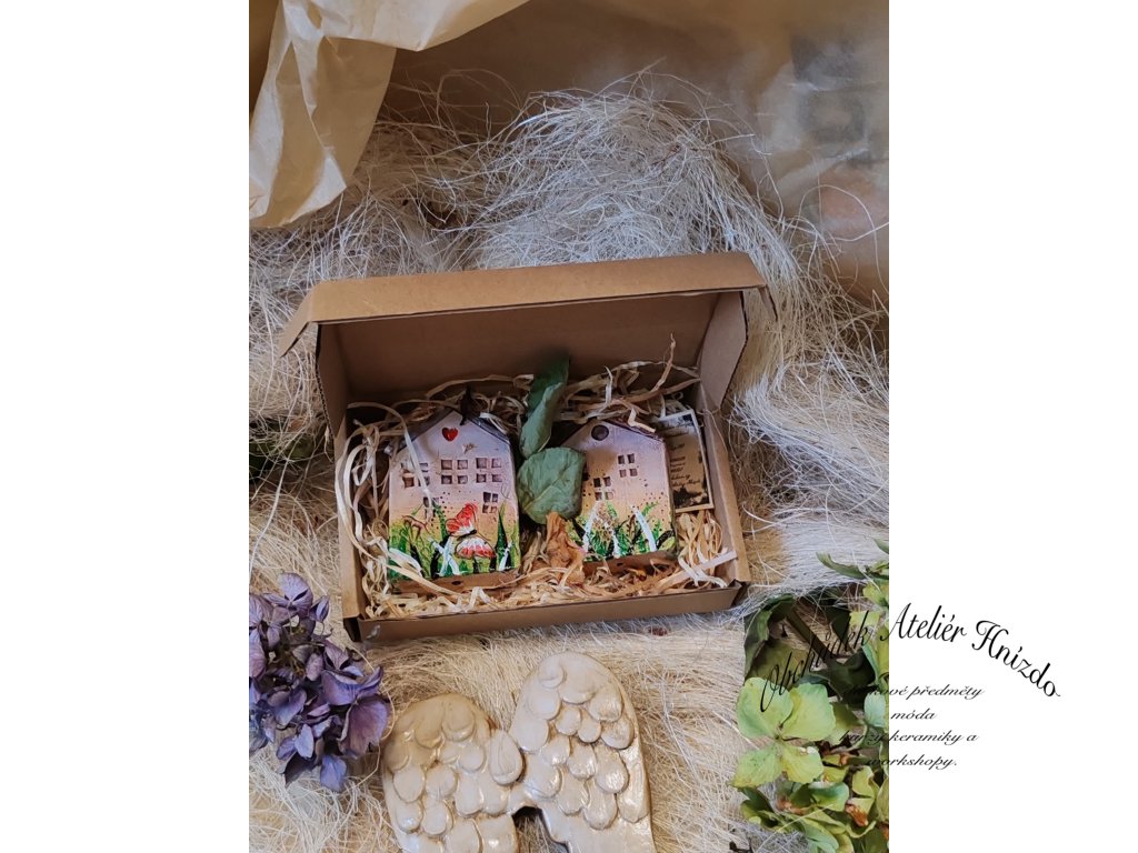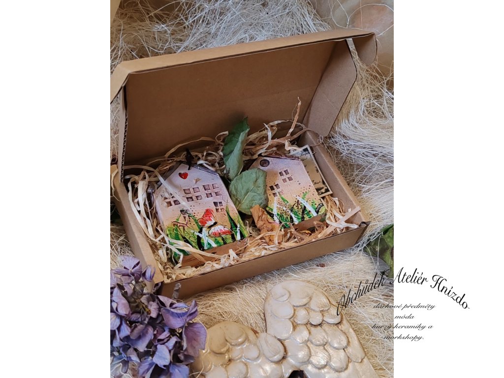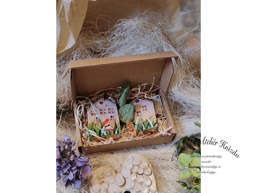 Originální sada dvou keramických domečků od Romany Laštovičkové, uložená v přírodní dárkové krabičce. Každý domeček je ručně modelovaný, pálený na vysokou teplotu (1200 °C), dekorovaný glazurami z Roudnice, oxidem železa a domalovaný barvami Darwi. Díky tomu jsou domečky pevné, odolné a vhodné jak do interiéru, tak i ven – snesou déšť i mráz.