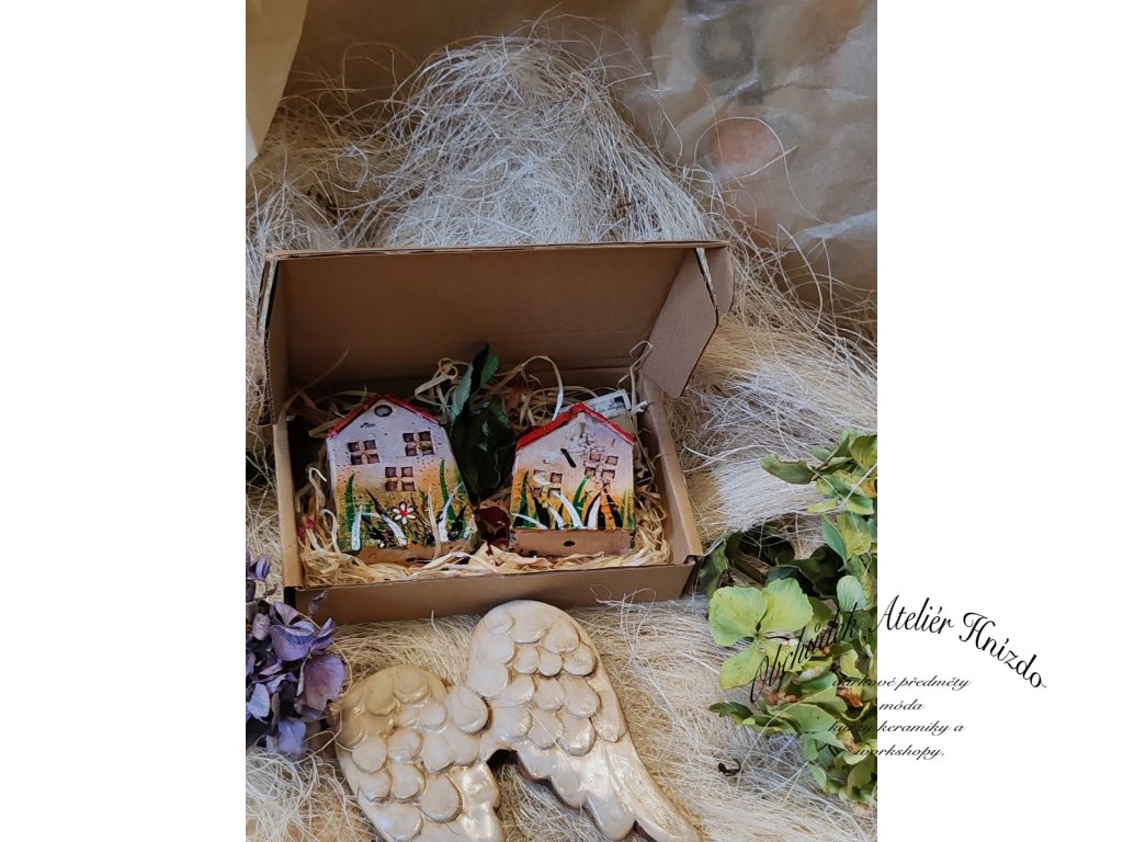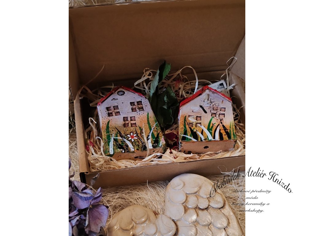 Originální sada dvou keramických domečků od Romany Laštovičkové, uložená v přírodní dárkové krabičce. Každý domeček je ručně modelovaný, pálený na vysokou teplotu (1200 °C), dekorovaný glazurami z Roudnice, oxidem železa a domalovaný barvami Darwi. Díky tomu jsou domečky pevné, odolné a vhodné jak do interiéru, tak i ven – snesou déšť i mráz.