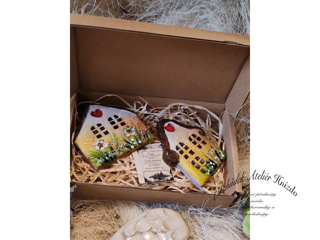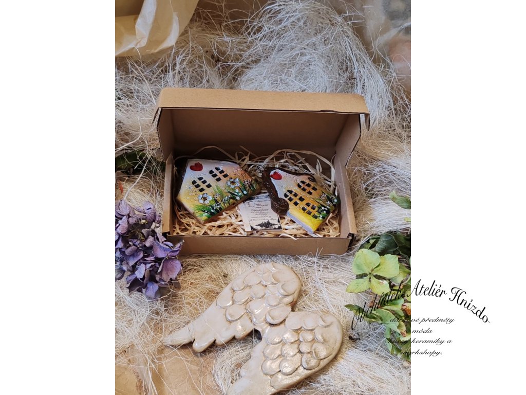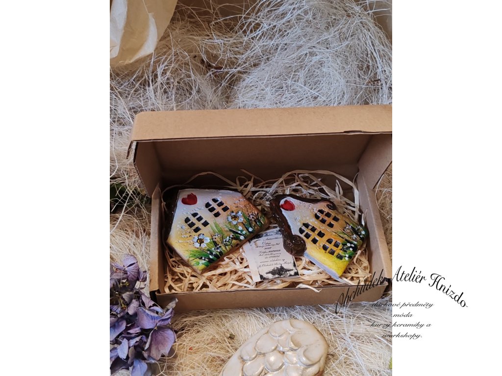 Originální sada dvou keramických domečků od Romany Laštovičkové, uložená v přírodní dárkové krabičce. Každý domeček je ručně modelovaný, pálený na vysokou teplotu (1200 °C), dekorovaný glazurami z Roudnice, oxidem železa a domalovaný barvami Darwi. Díky tomu jsou domečky pevné, odolné a vhodné jak do interiéru, tak i ven – snesou déšť i mráz.