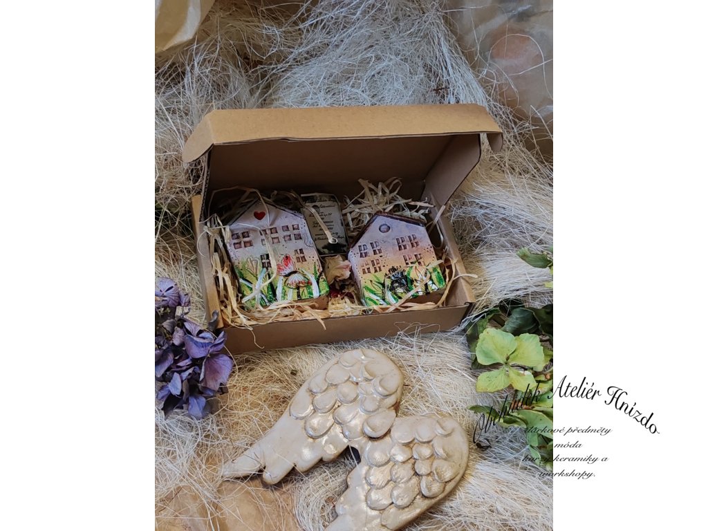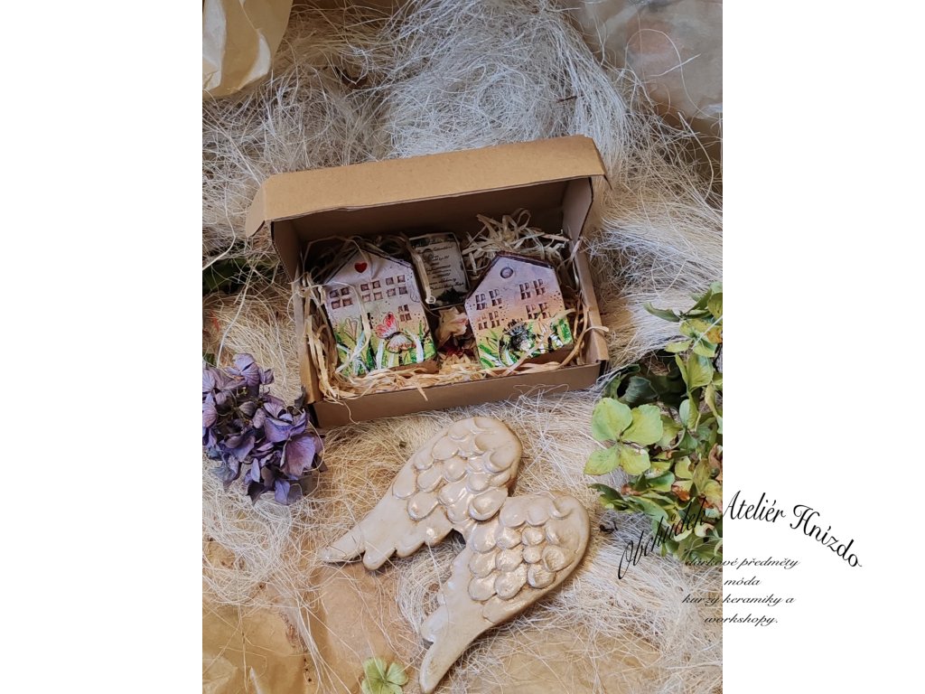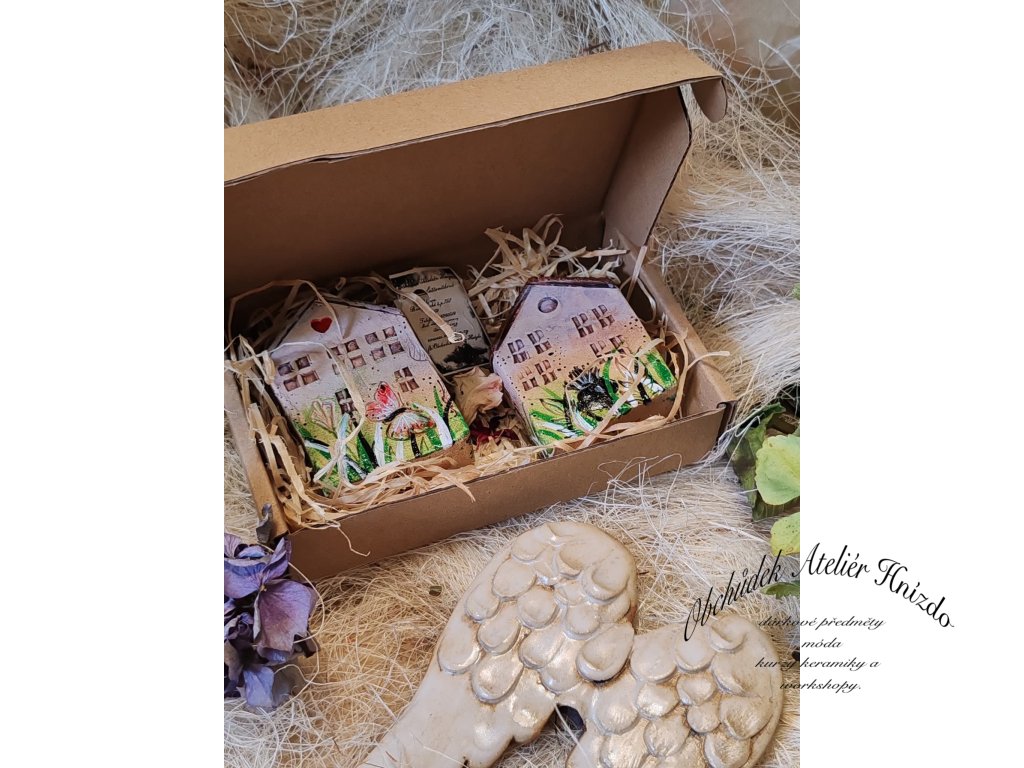 Originální sada dvou keramických domečků od Romany Laštovičkové, uložená v přírodní dárkové krabičce. Každý domeček je ručně modelovaný, pálený na vysokou teplotu (1200 °C), dekorovaný glazurami z Roudnice, oxidem železa a domalovaný barvami Darwi. Díky tomu jsou domečky pevné, odolné a vhodné jak do interiéru, tak i ven – snesou déšť i mráz.