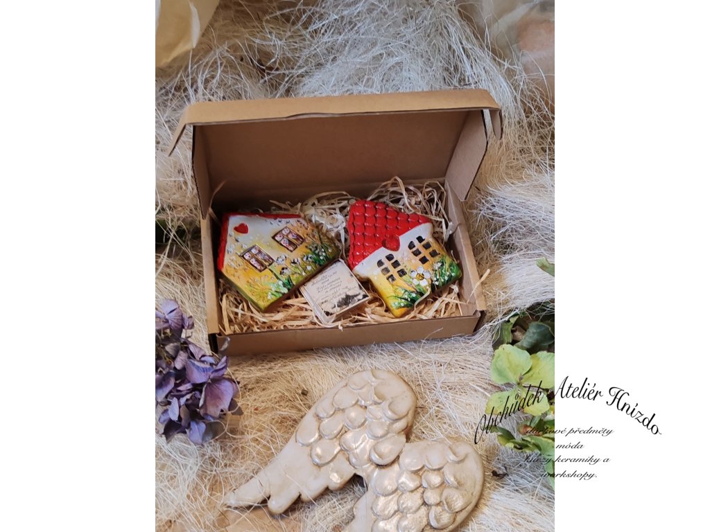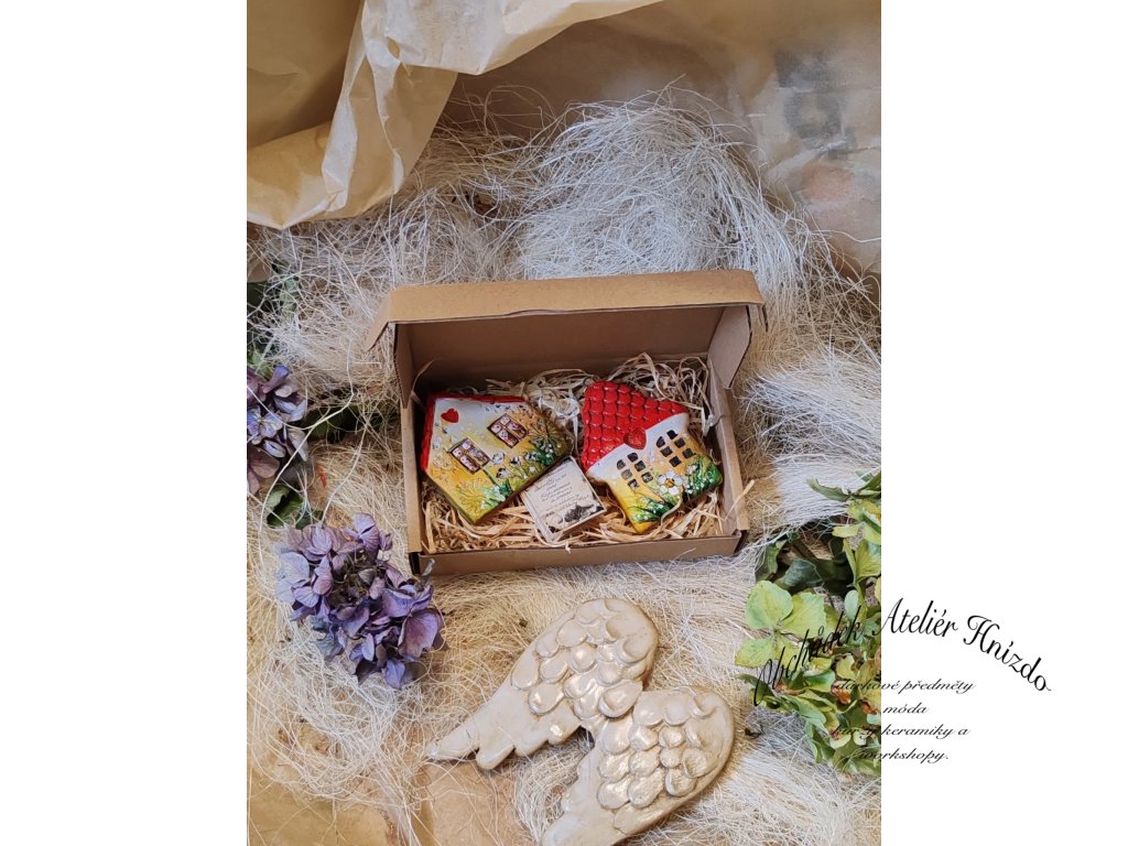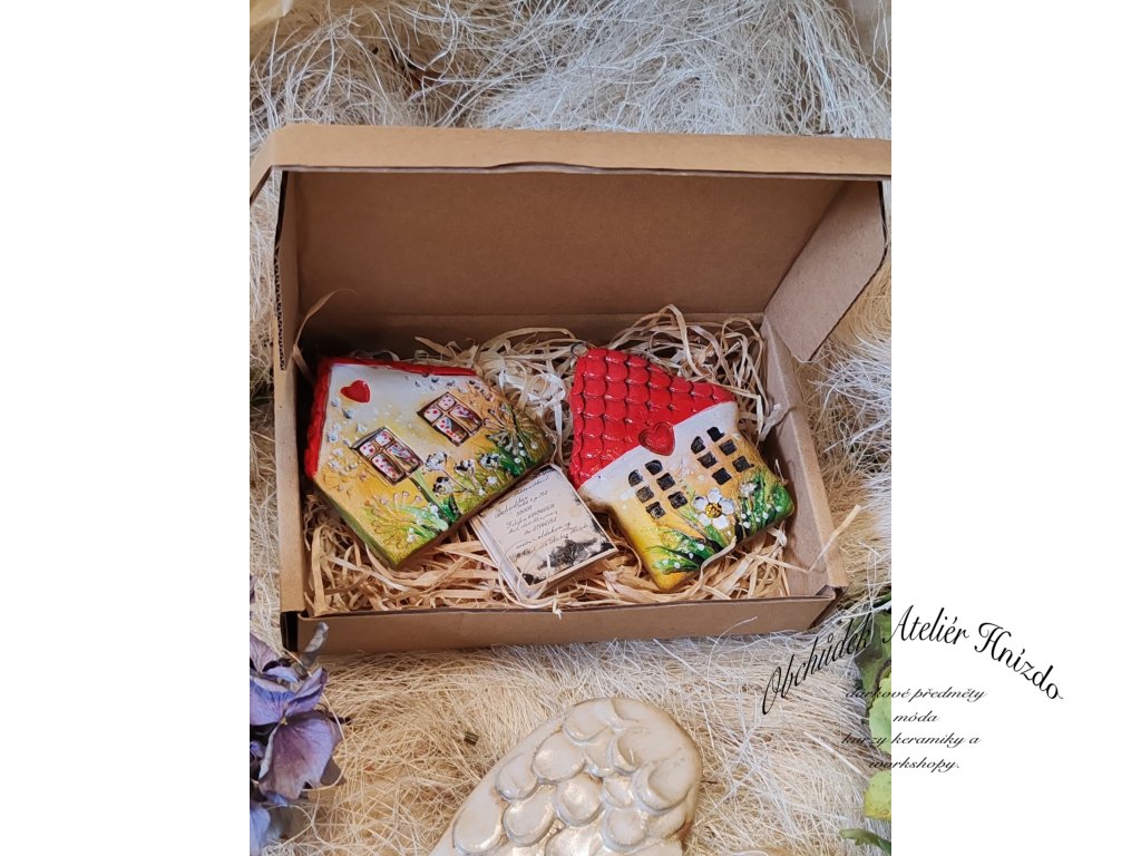 Originální sada dvou keramických domečků od Romany Laštovičkové, uložená v přírodní dárkové krabičce. Každý domeček je ručně modelovaný, pálený na vysokou teplotu (1200 °C), dekorovaný glazurami z Roudnice, oxidem železa a domalovaný barvami Darwi. Díky tomu jsou domečky pevné, odolné a vhodné jak do interiéru, tak i ven – snesou déšť i mráz.