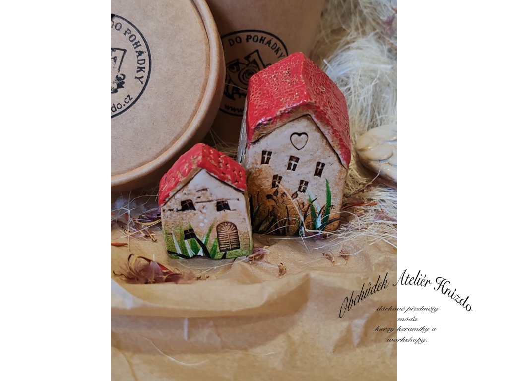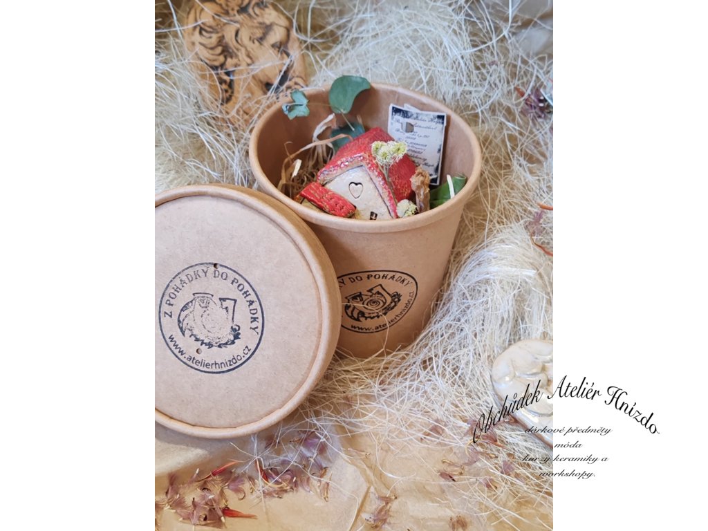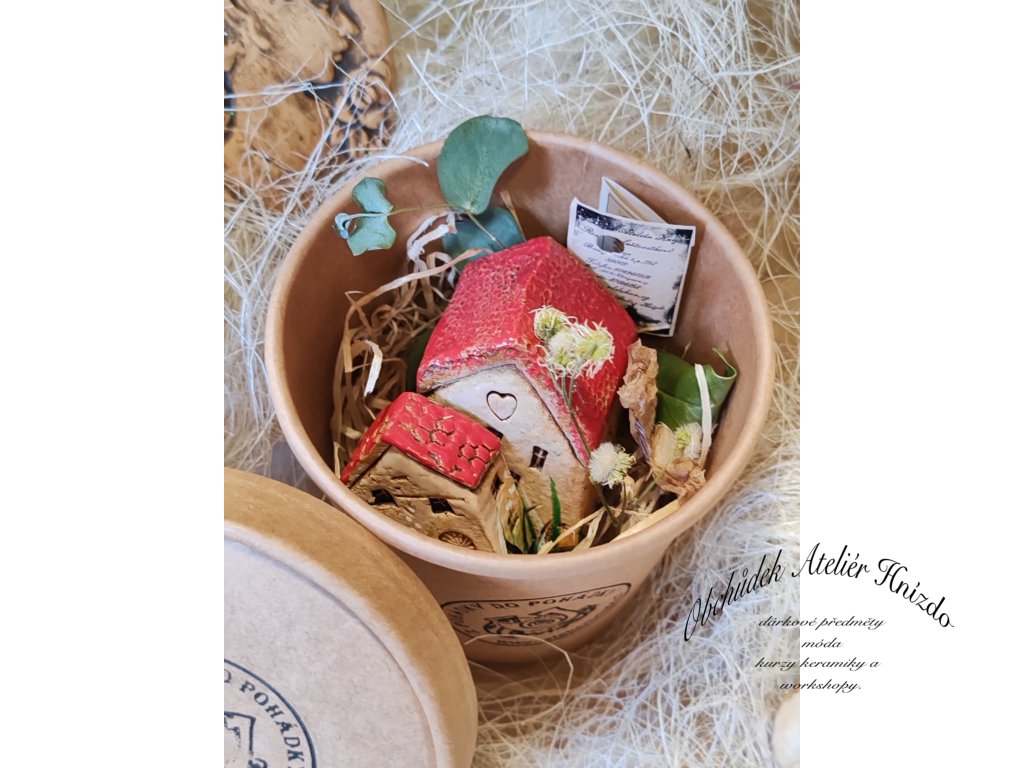 Originální kulatá dárková krabička z Ateliéru Hnízdo, která v sobě ukrývá ručně vyráběné keramické domečky od Romany Laštovičkové. Každý domeček je autorský originál – ručně modelovaný, pálený na vysokou teplotu (1200 °C), dekorovaný glazurami z Roudnice, oxidem železa a domalovaný barvami Darwi. Díky tomu jsou domečky pevné, odolné a mohou zdobit nejen interiér, ale i venkovní prostor – snesou déšť i mráz.