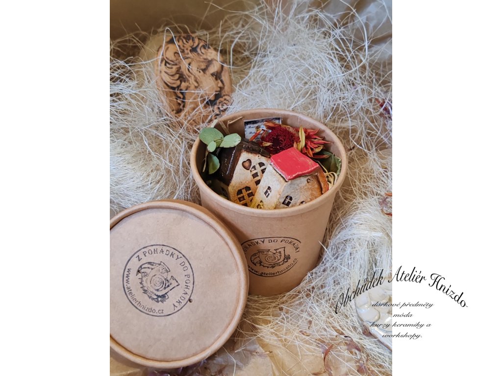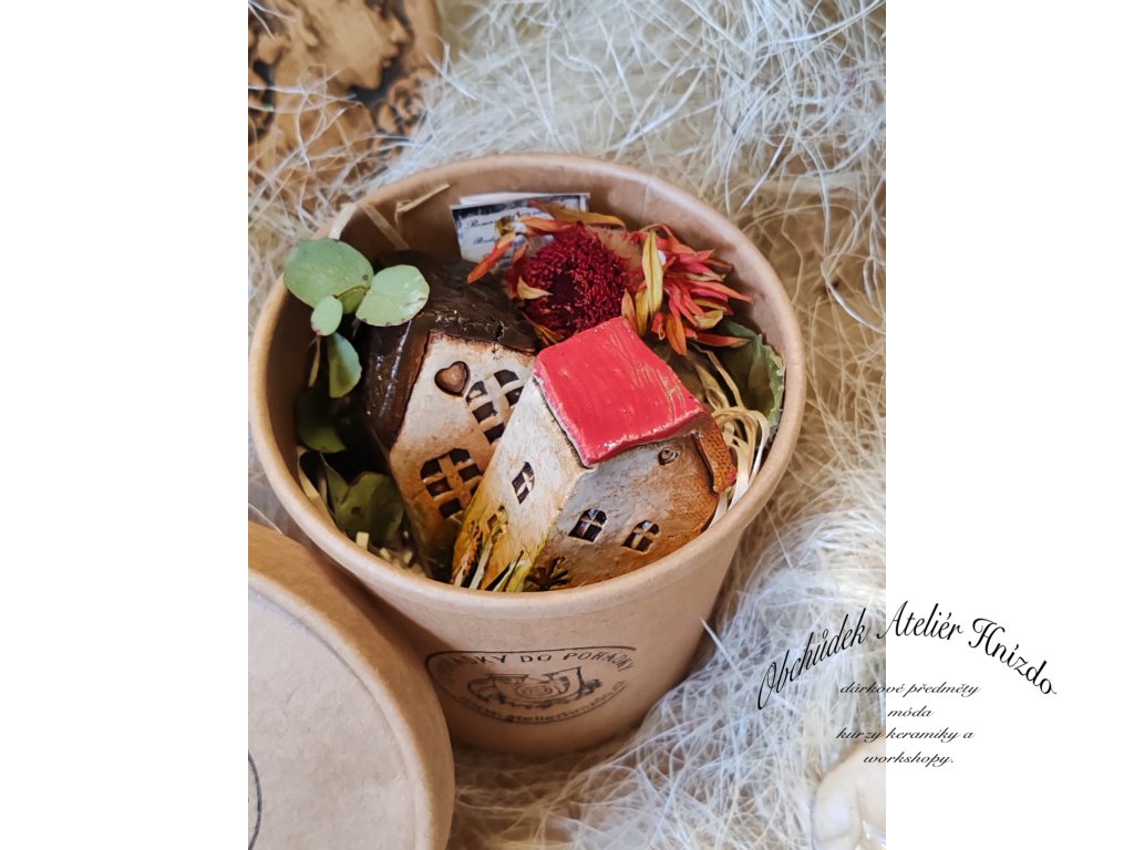 Originální kulatá dárková krabička z Ateliéru Hnízdo, která v sobě ukrývá ručně vyráběné keramické domečky od Romany Laštovičkové. Každý domeček je autorský originál – ručně modelovaný, pálený na vysokou teplotu (1200 °C), dekorovaný glazurami z Roudnice, oxidem železa a domalovaný barvami Darwi. Díky tomu jsou domečky pevné, odolné a mohou zdobit nejen interiér, ale i venkovní prostor – snesou déšť i mráz.