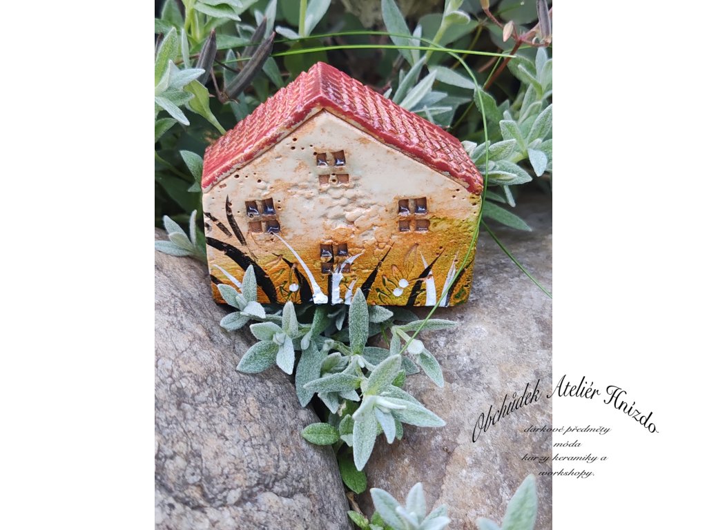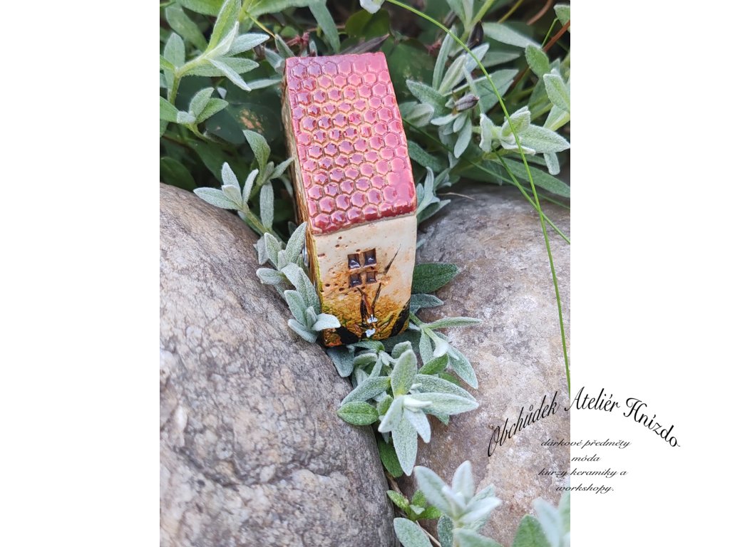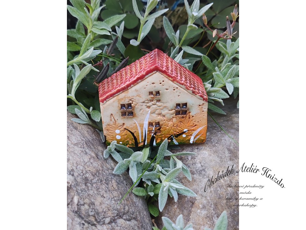 Originální ručně vyráběný keramický domeček na zápich je krásnou dekorací do květináče, truhlíku i zahrádky. Každý kousek je jedinečný – velikost se pohybuje přibližně kolem 6 × 2 × 5 cm.
