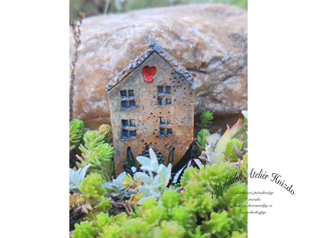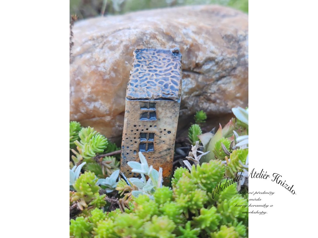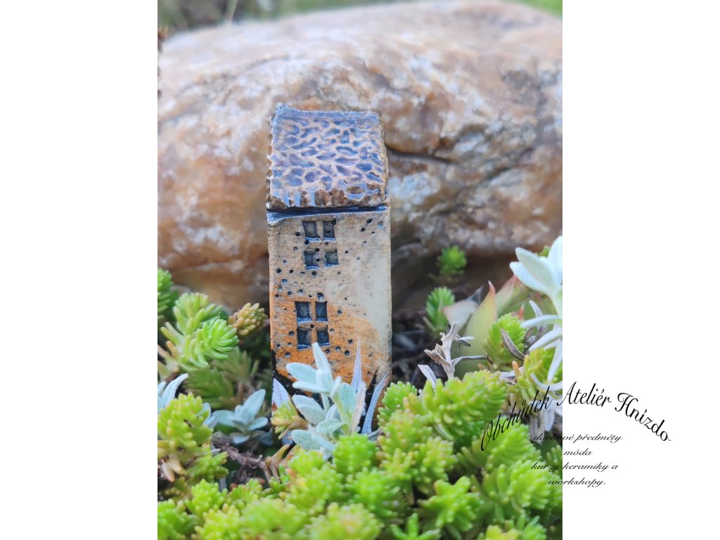 Originální ručně vyráběný keramický domeček na zápich je krásnou dekorací do květináče, truhlíku i zahrádky. Každý kousek je jedinečný – velikost se pohybuje přibližně kolem 6 × 2 × 5 cm.