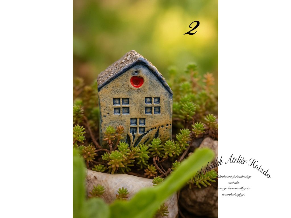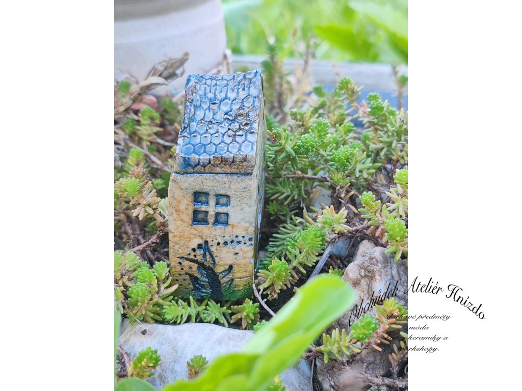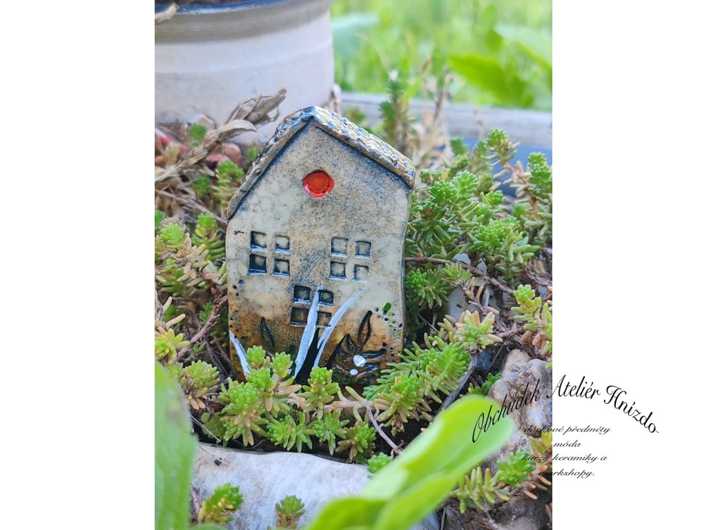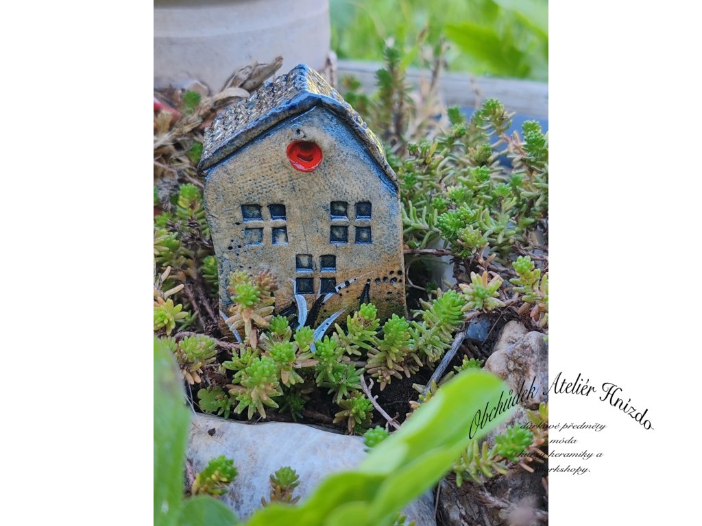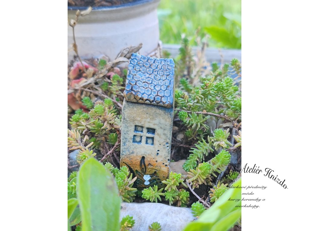 Originální ručně vyráběný keramický domeček na zápich je krásnou dekorací do květináče, truhlíku i zahrádky. Každý kousek je jedinečný – velikost se pohybuje přibližně kolem 6 × 2 × 5 cm.