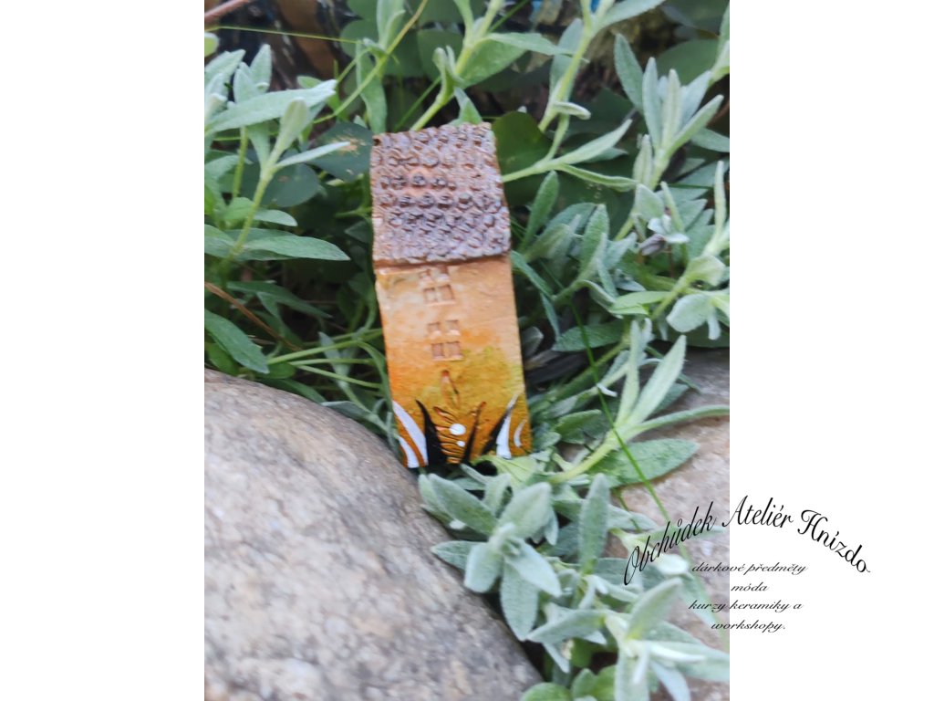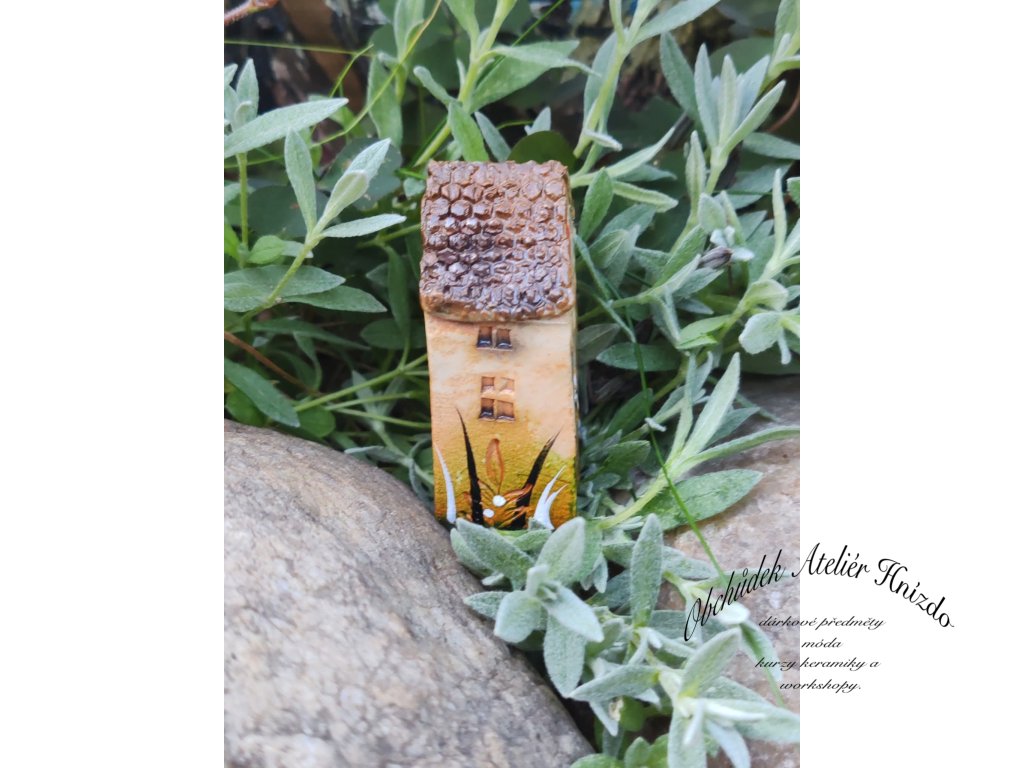 Originální ručně vyráběný keramický domeček na zápich je krásnou dekorací do květináče, truhlíku i zahrádky. Každý kousek je jedinečný – velikost se pohybuje přibližně kolem 6 × 2 × 5 cm.