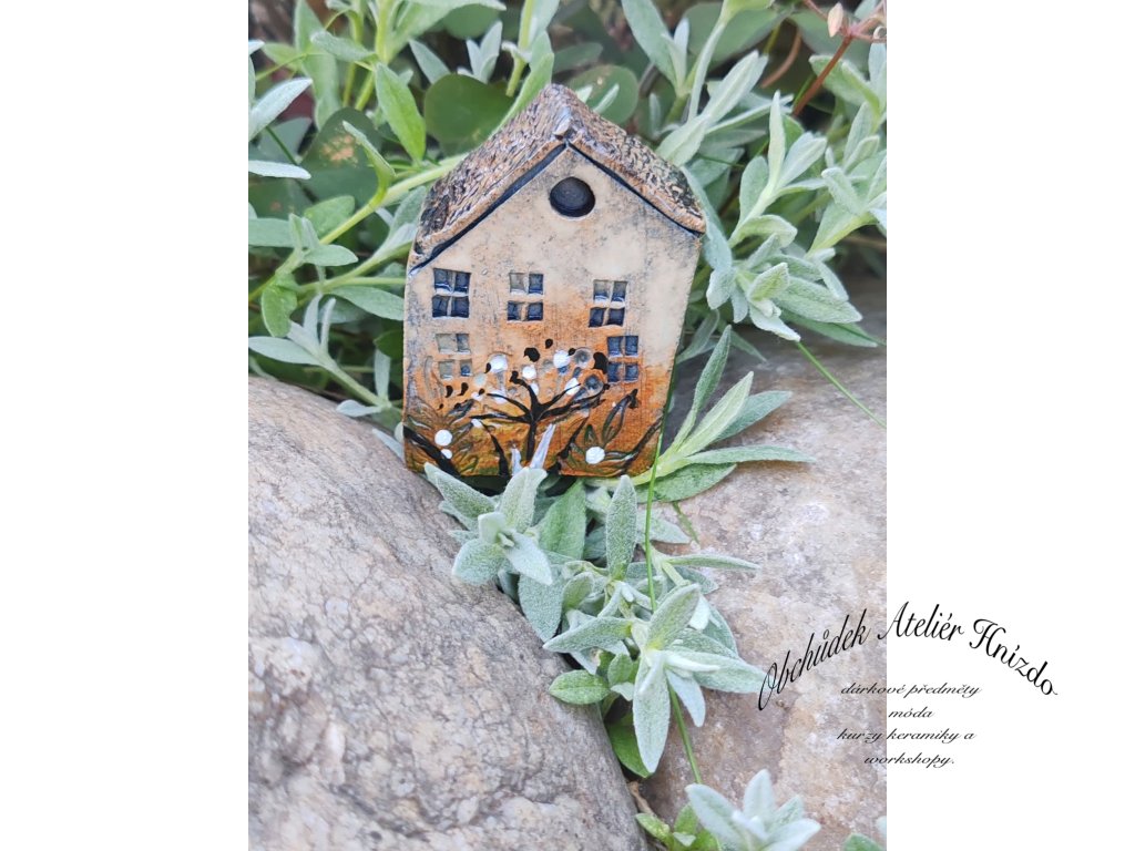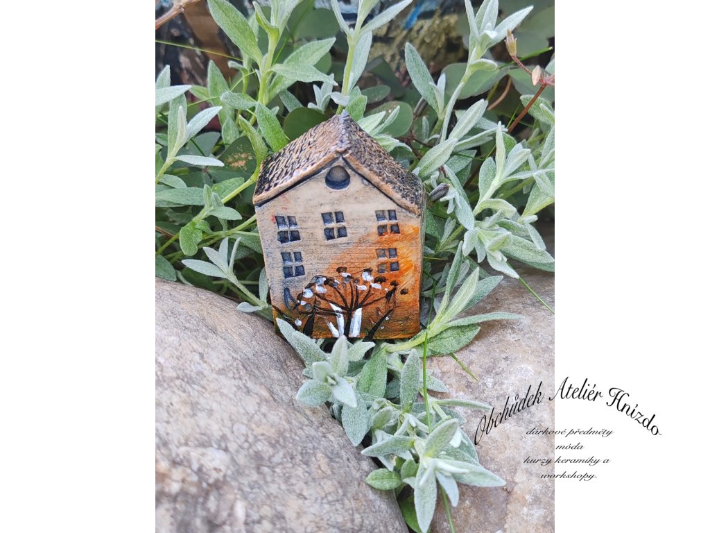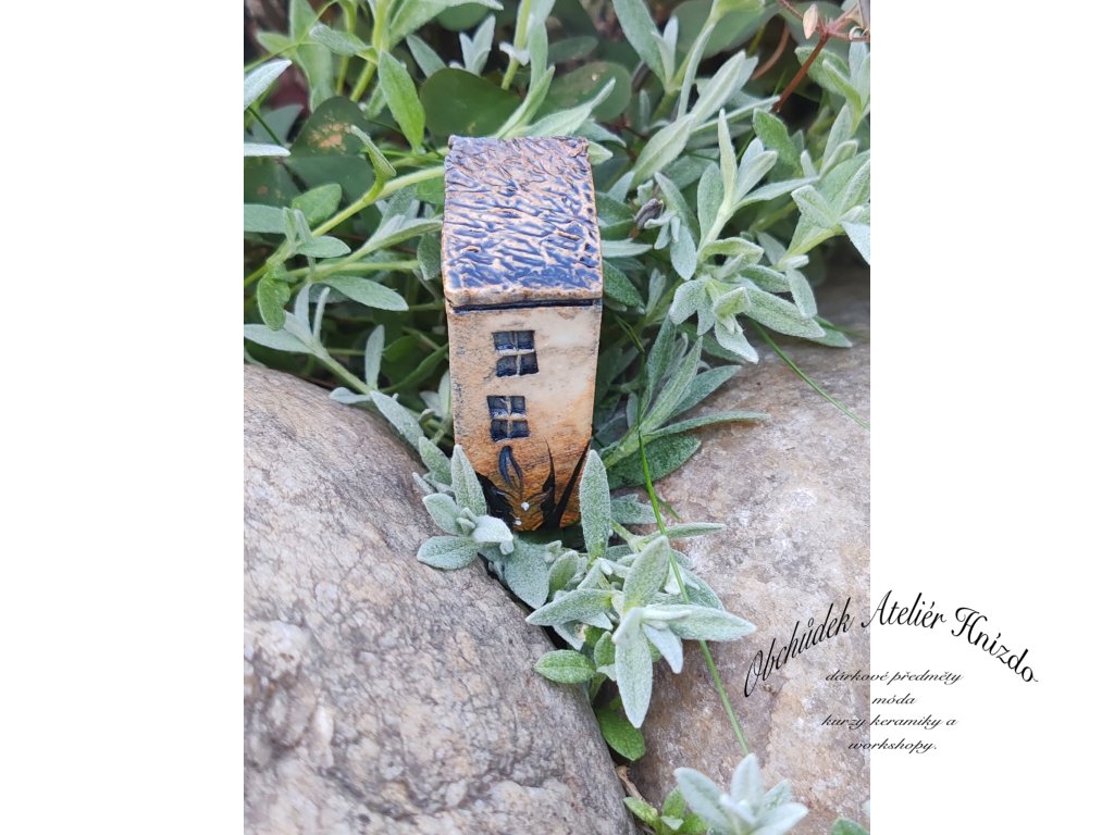 Originální ručně vyráběný keramický domeček na zápich je krásnou dekorací do květináče, truhlíku i zahrádky. Každý kousek je jedinečný – velikost se pohybuje přibližně kolem 6 × 2 × 5 cm.