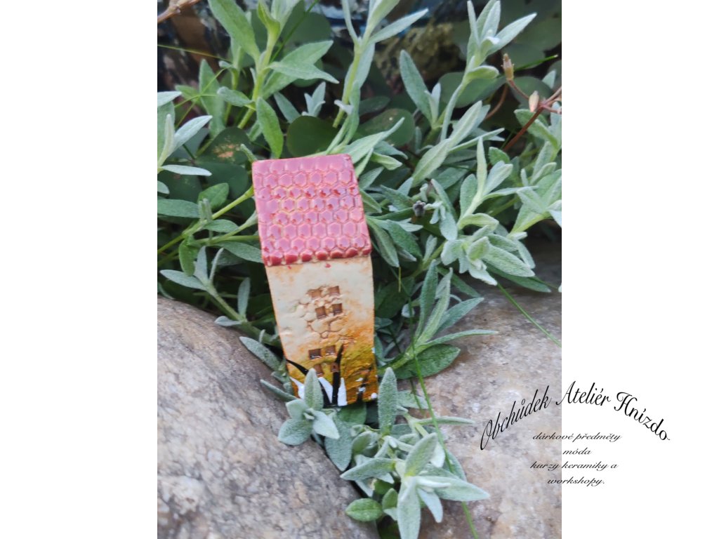 Originální ručně vyráběný keramický domeček na zápich je krásnou dekorací do květináče, truhlíku i zahrádky. Každý kousek je jedinečný – velikost se pohybuje přibližně kolem 6 × 2 × 5 cm.