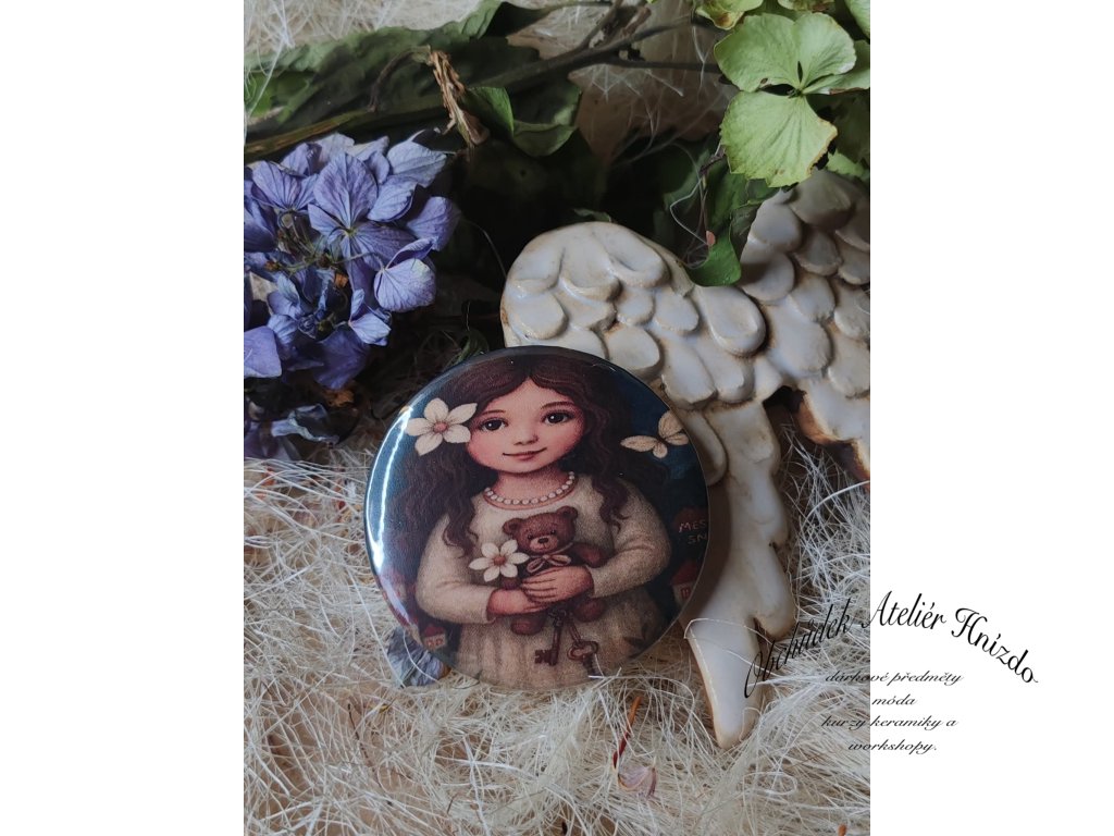 Holčička s rozpuštěnými vlásky, květ ve vlasech, s medvídkem v dlaních-špendlík