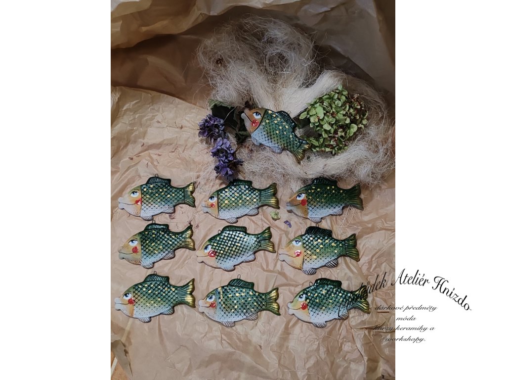Veselá a jemně laděná dekorace s typickým rukopisem autorky – ručně malované šupiny s metalickým leskem, roztomilý pohled a drobný detail červené šňůrky v tlamičce. Kapřík může být zavěšený i položený, skvěle doplní vánoční i celoroční výzdobu.