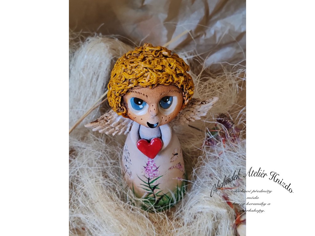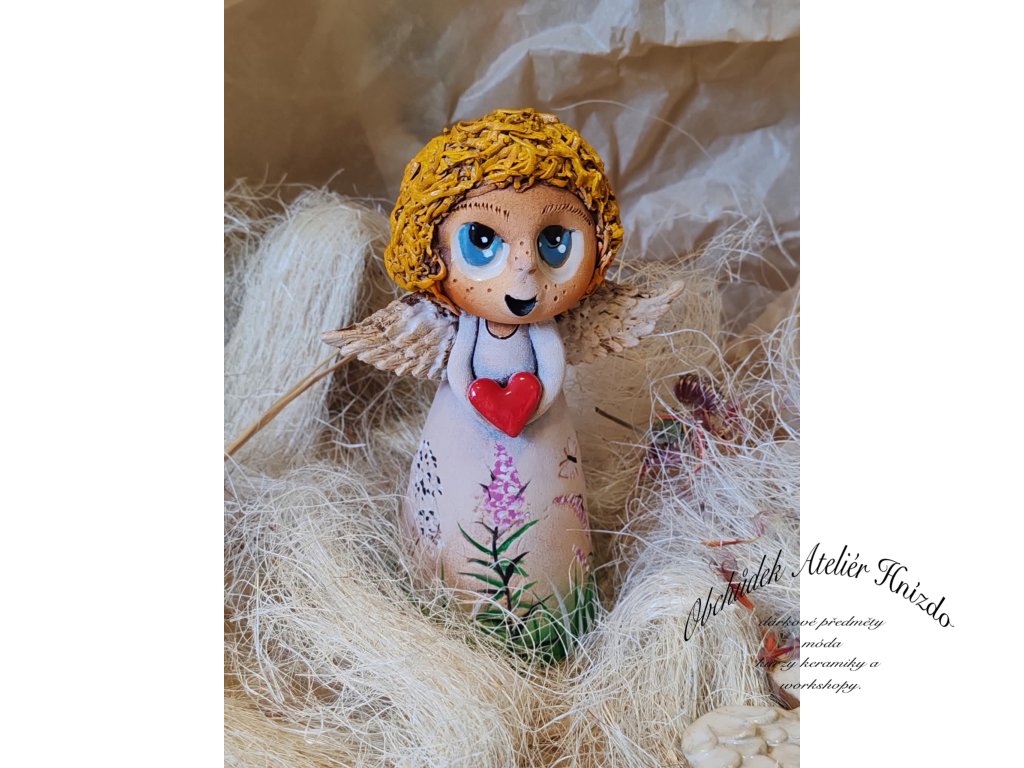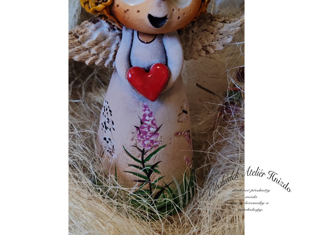 Ručně modelovaný keramický andílek ve tvaru zvonečku z Ateliéru Hnízdo, originální autorský výrobek Romany Laštovičkové. Každý andílek je originál – nikdy nevznikají dva stejní. Je zdoben ručně malovanými květinovými motivy a v rukou drží červené srdíčko jako symbol radosti a lásky.