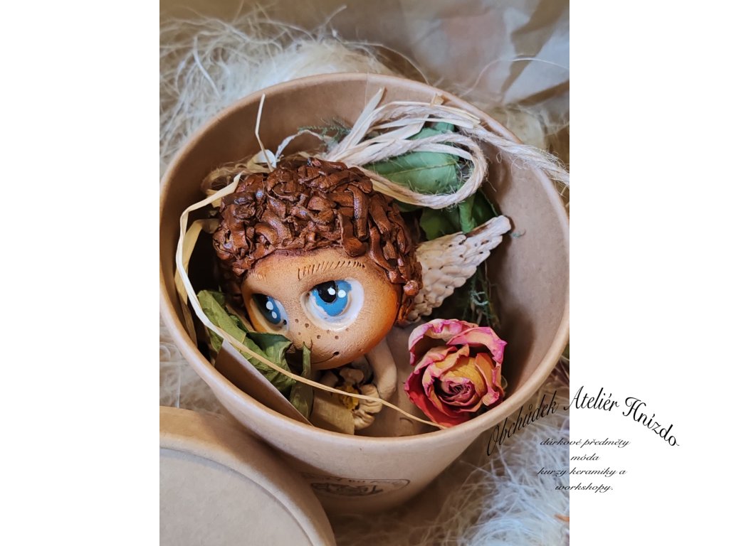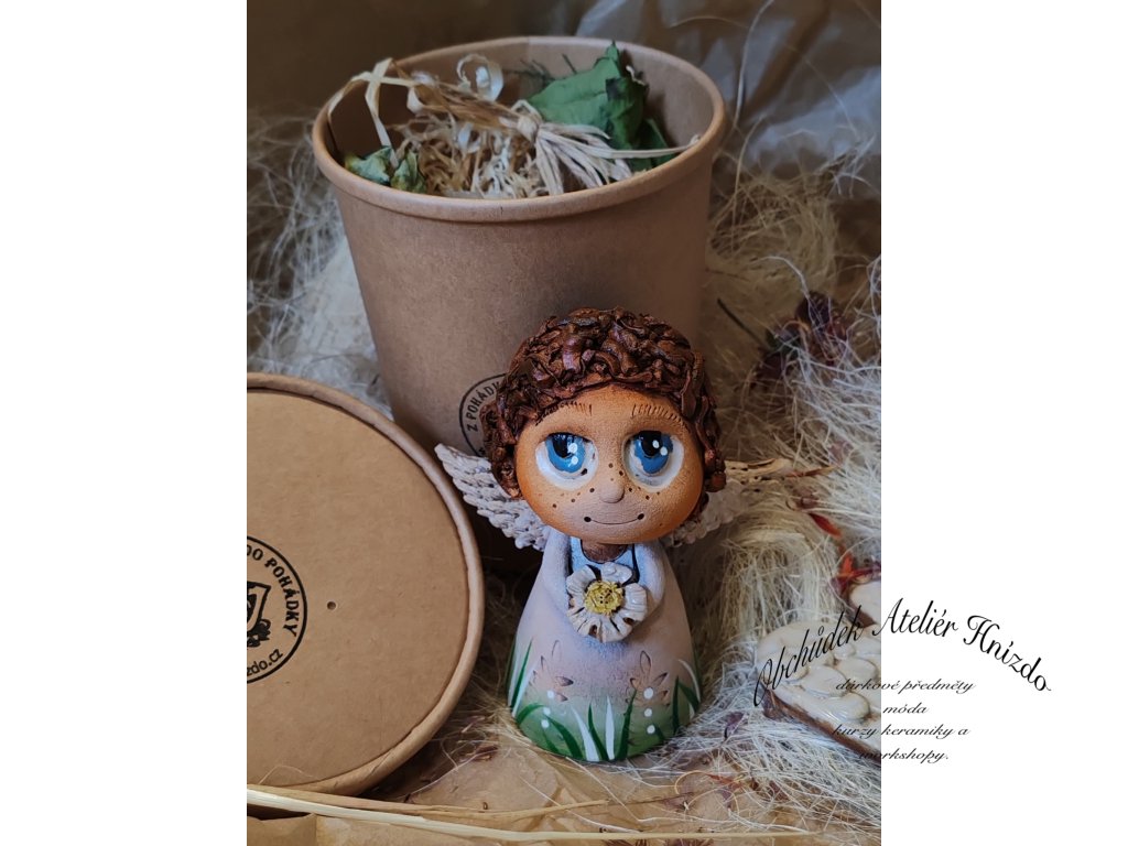 Roztomilý keramický andílek ve tvaru zvonečku z Ateliéru Hnízdo, originální autorský výrobek Romany Laštovičkové. Každý andílek je ručně modelovaný, malovaný a zdobený drobnými detaily, takže žádní dva nejsou stejní – vždy jde o jedinečný originál.