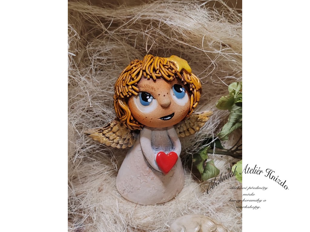 Ručně modelovaný keramický anděl ve tvaru zvonečku z Ateliéru Hnízdo, autorský výrobek Romany Laštovičkové.