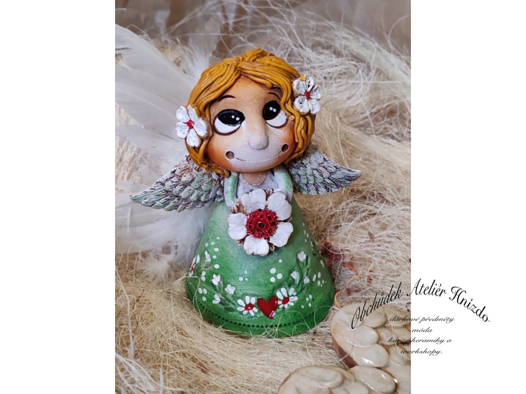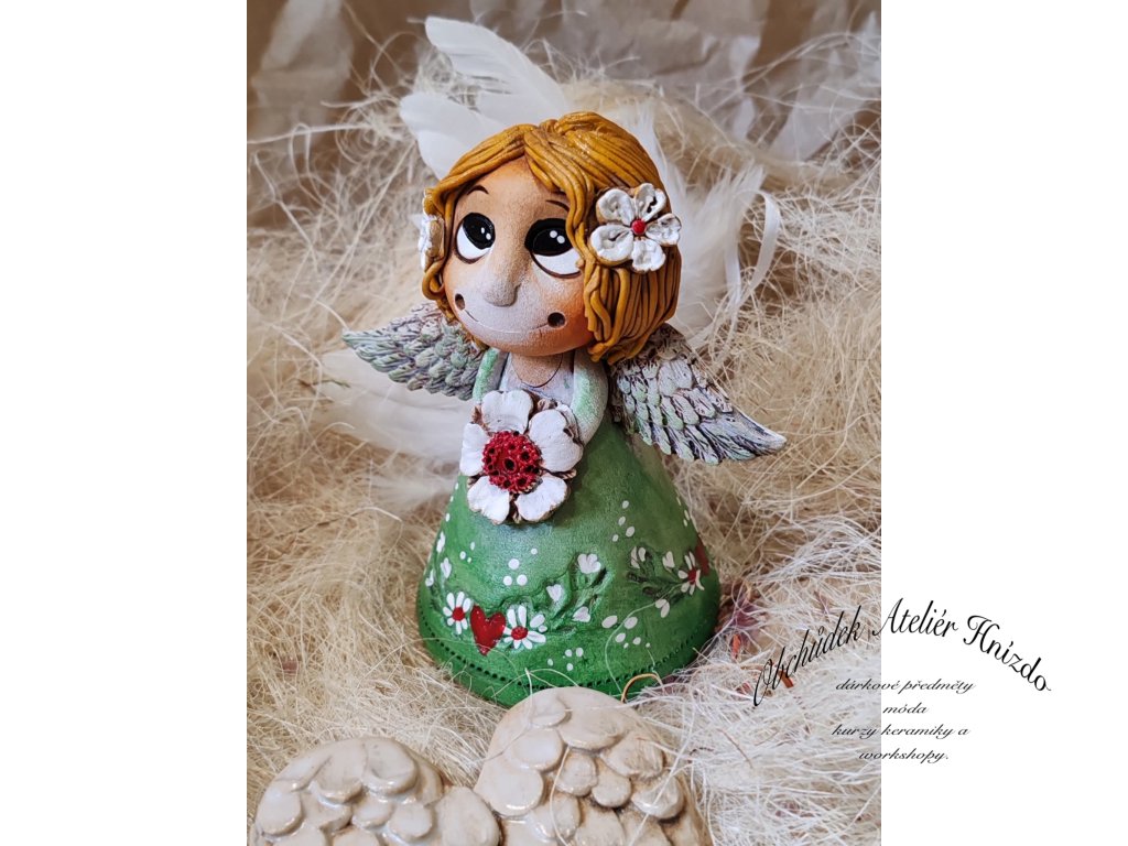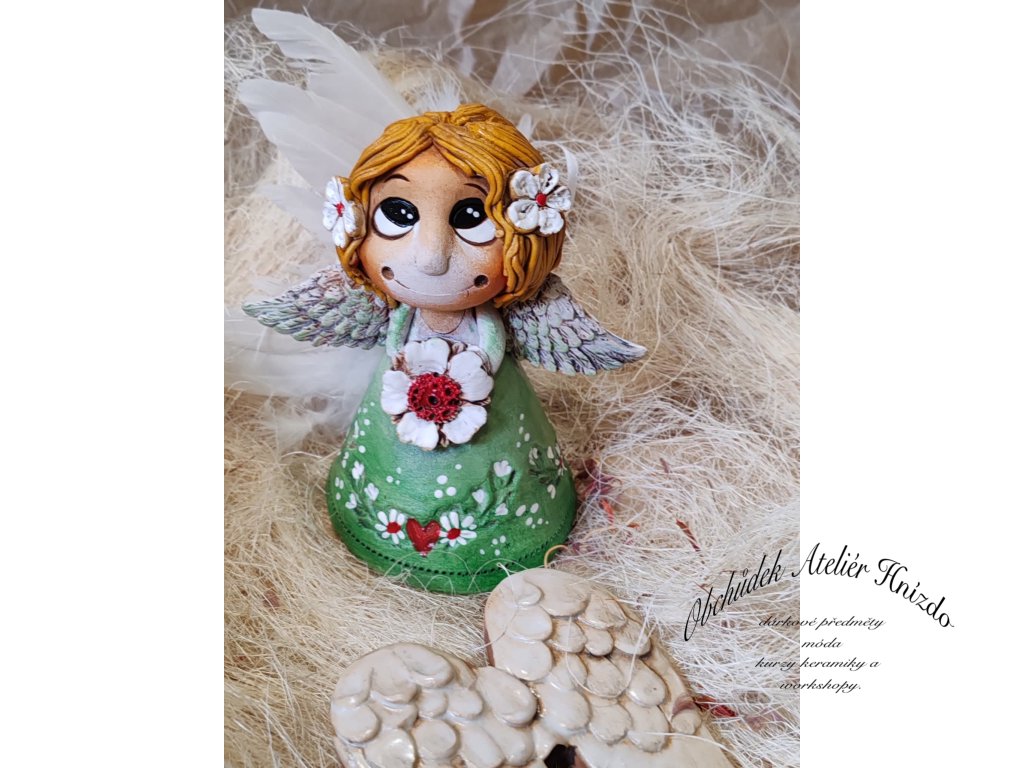 Ručně modelovaná keramická andělka ve tvaru zvonečku z Ateliéru Hnízdo, autorský výrobek Romany Laštovičkové. Každá andělka je originál – zdobená jemnými detaily, ručně malovanými květinovými motivy a něžnými křídly. V zelených šatech s bílými kvítky a červeným srdcem působí jako kouzelný ochránce i krásná dekorace.