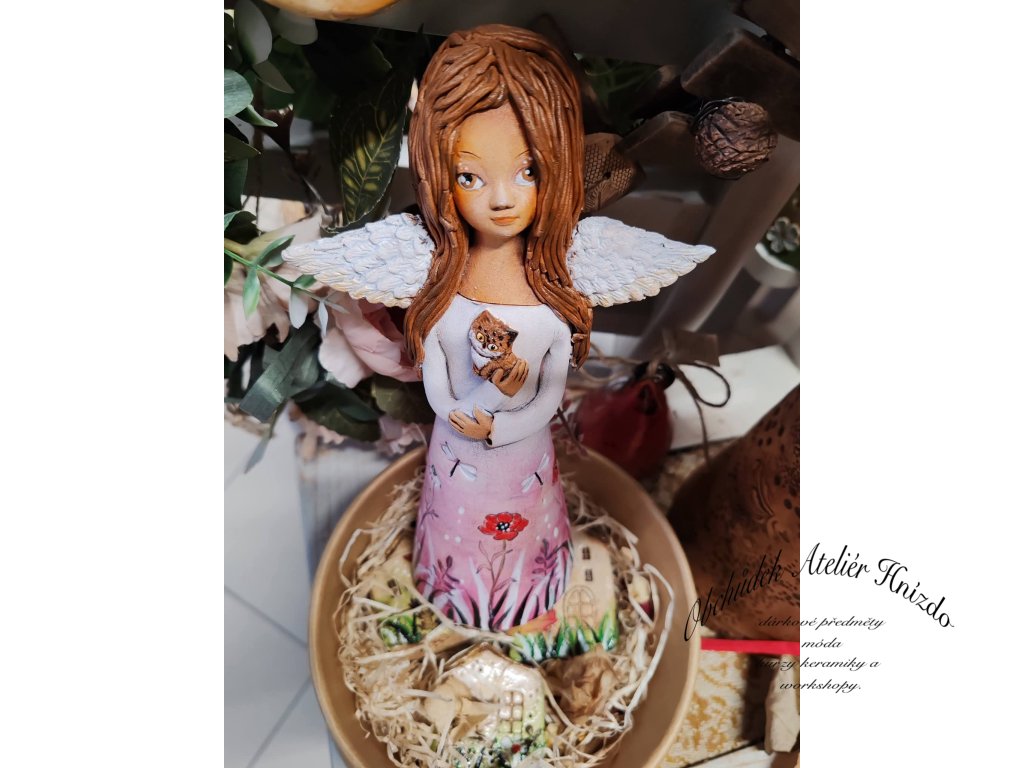 Ručně vyrobený keramický andílek s jemným pohledem, bílými křidélky a malou kočičkou v náručí. Něná, pohádková postavička, která vyzařuje klid, ochranu a lásku – krásná dekorace do domova i milý dárek od srdce.