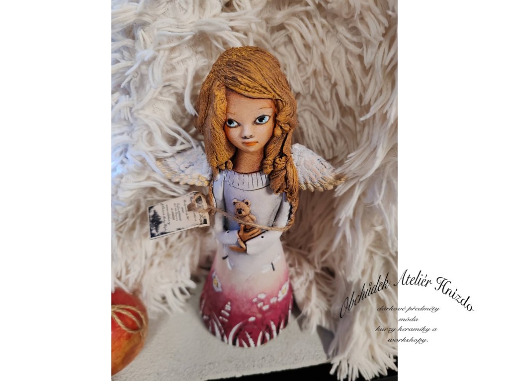 Ručně vyrobený keramický andílek s jemným výrazem, bílými křidélky a malým medvídkem v náručí. Pohádková postavička s klidnou, hřejivou energií, která vnese do domova pocit bezpečí, něhy a radosti. Krásná dekorace i milý dárek od srdce.