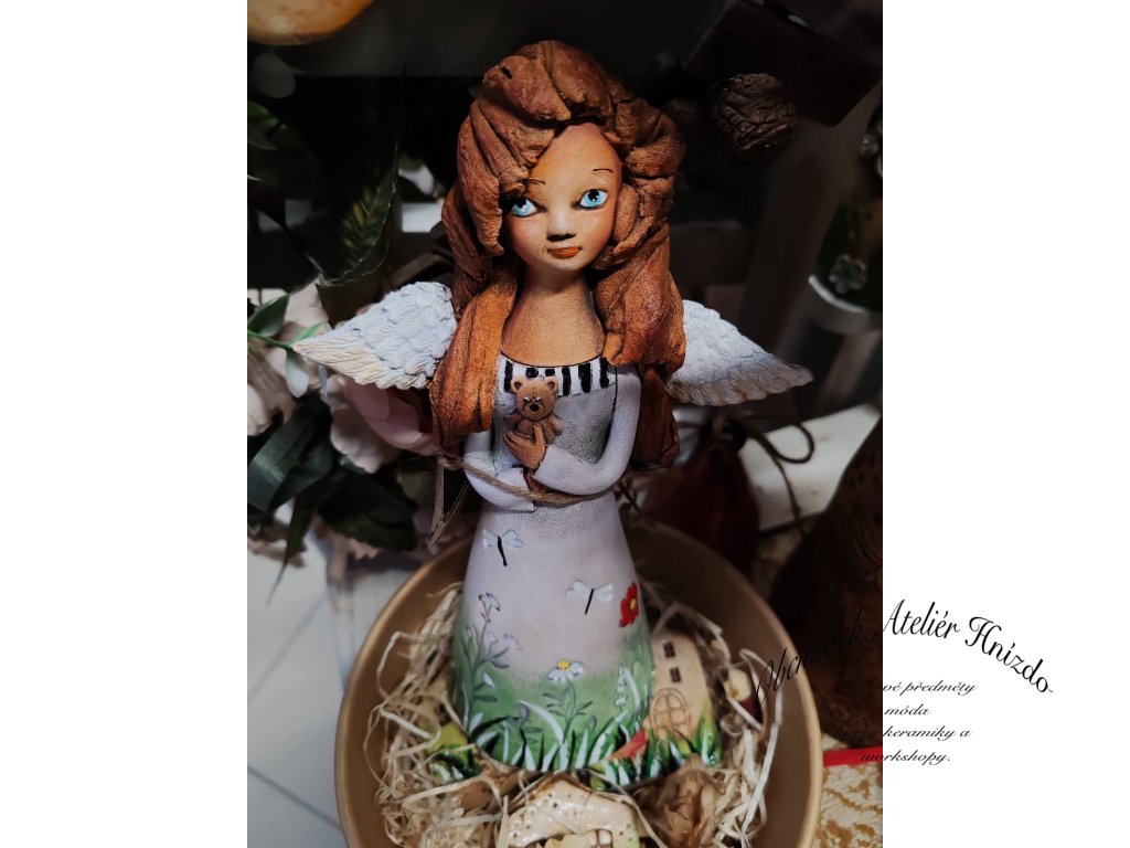 Ručně vyrobený keramický andílek s jemným pohledem, bílými křidélky a malým medvídkem v náručí. Něná, pohádková postavička, která vyzařuje klid, ochranu a lásku. Krásná dekorace do interiéru i milý dárek od srdce.
