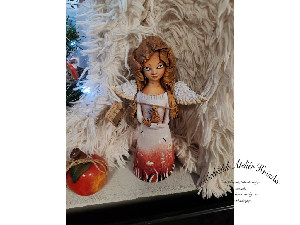 Ručně vyrobený keramický andílek s jemným výrazem, bílými křidélky a malým medvídkem v náručí. Pohádková postavička s klidnou, hřejivou energií, která vnese do domova pocit bezpečí a něhy. Krásná dekorace i dárek od srdce.