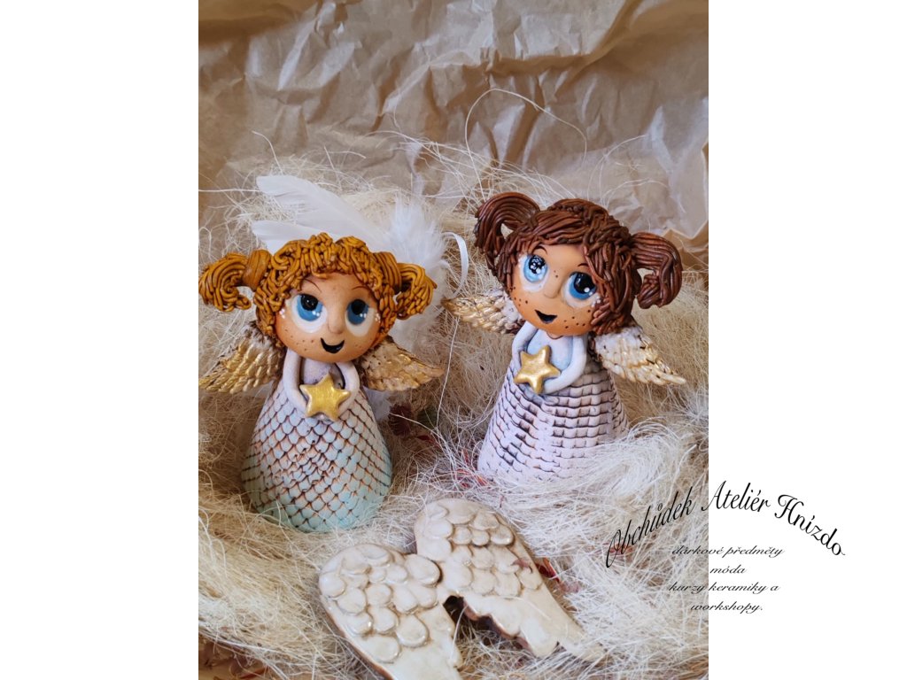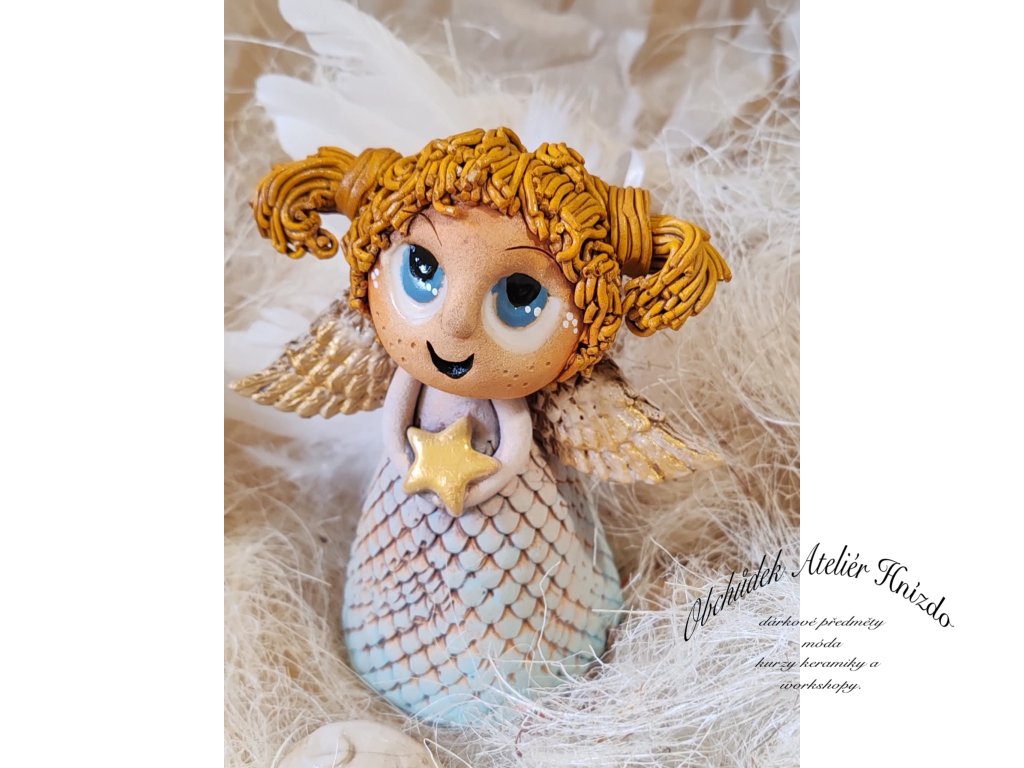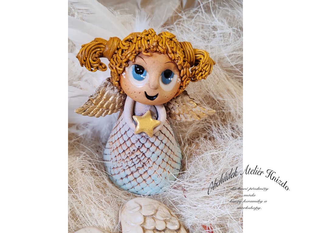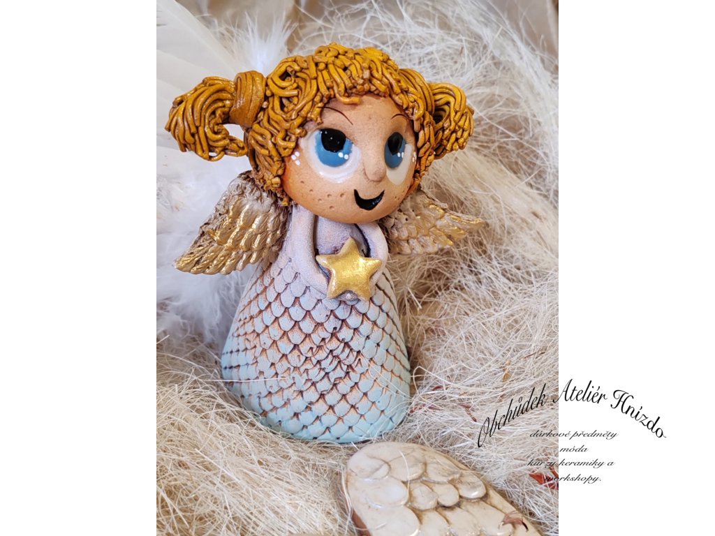 Originální keramický andílek ve tvaru zvonečku z Ateliéru Hnízdo, autorský výrobek Romany Laštovičkové. Každý anděl je jedinečný originál, modelovaný a malovaný ručně s jemnými detaily. Tento andílek s hvězdičkou symbolizuje radost, ochranu a světlo.