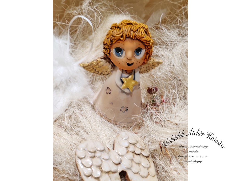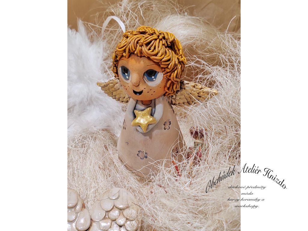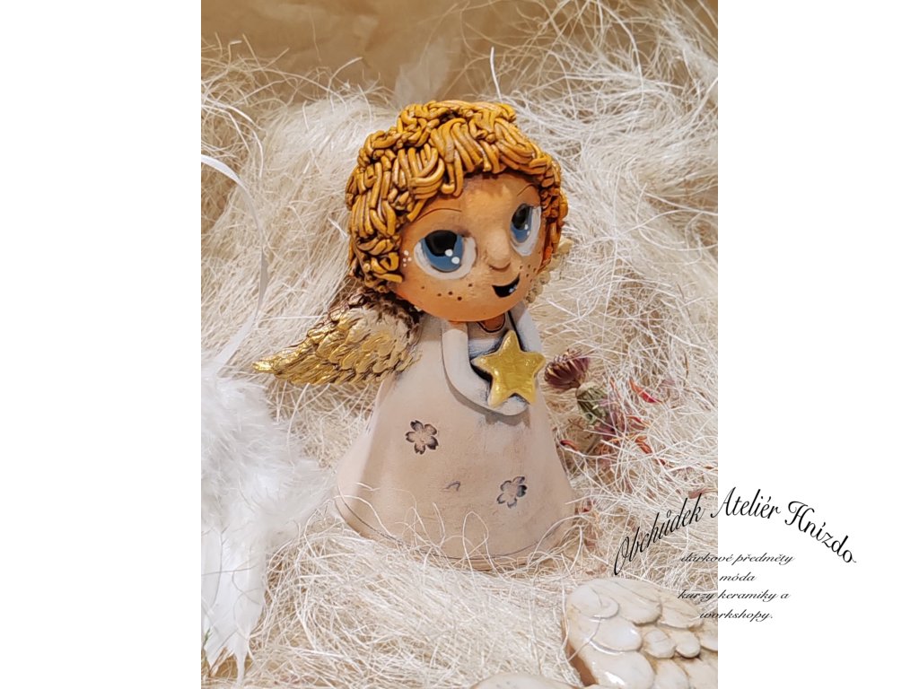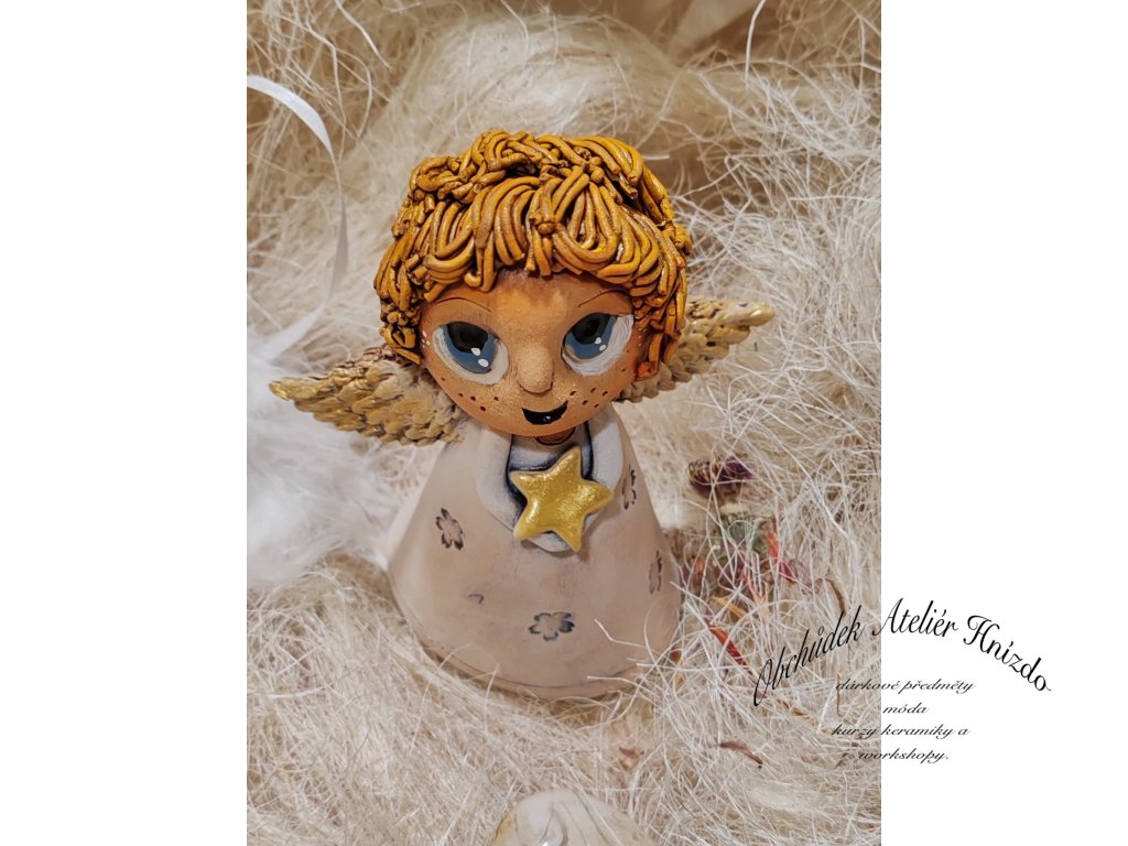 Originální keramický andílek ve tvaru zvonečku z Ateliéru Hnízdo, autorský výrobek Romany Laštovičkové. Každý anděl je jedinečný originál, modelovaný a malovaný ručně s jemnými detaily. Tento andílek s hvězdičkou symbolizuje radost, ochranu a světlo.