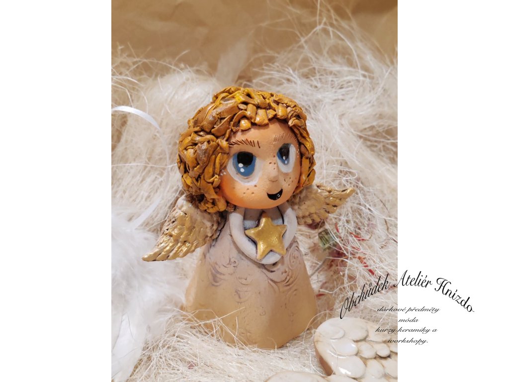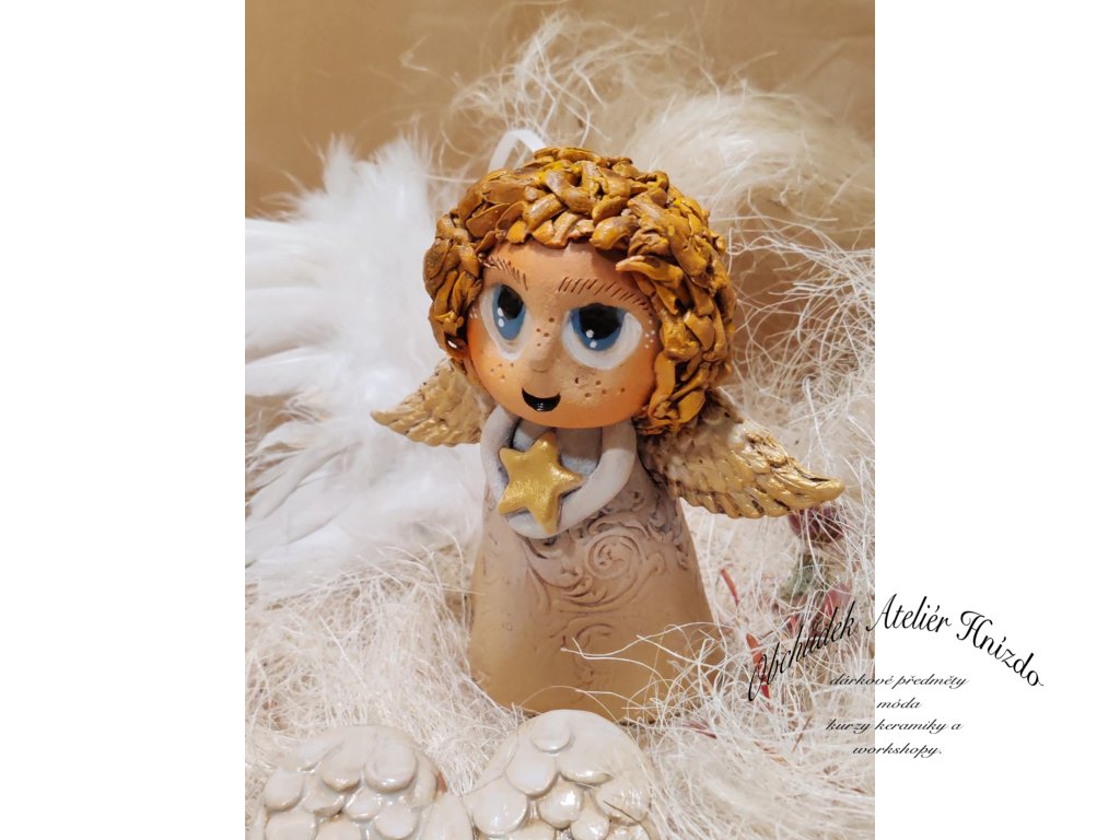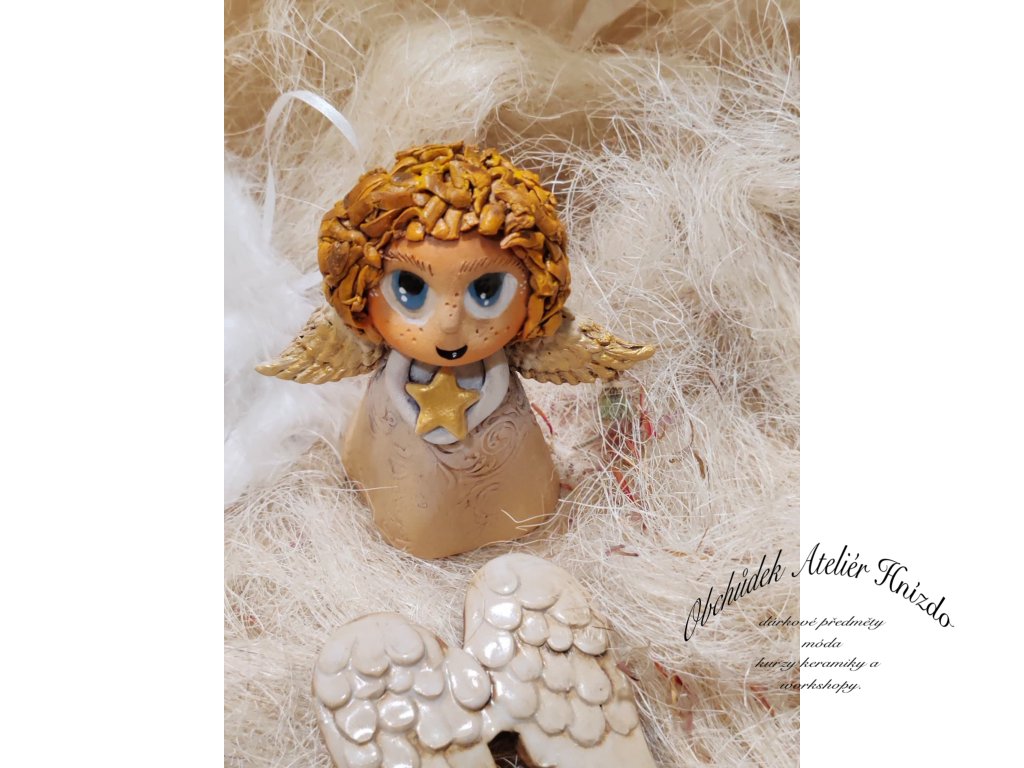 Originální keramický andílek ve tvaru zvonečku z Ateliéru Hnízdo, autorský výrobek Romany Laštovičkové. Každý anděl je jedinečný originál, modelovaný a malovaný ručně s jemnými detaily. Tento andílek s hvězdičkou symbolizuje radost, ochranu a světlo.