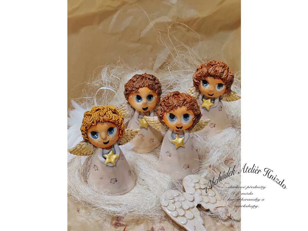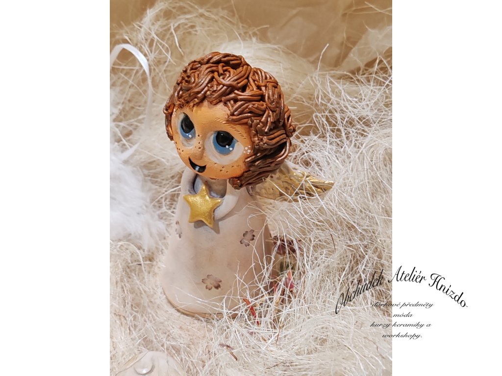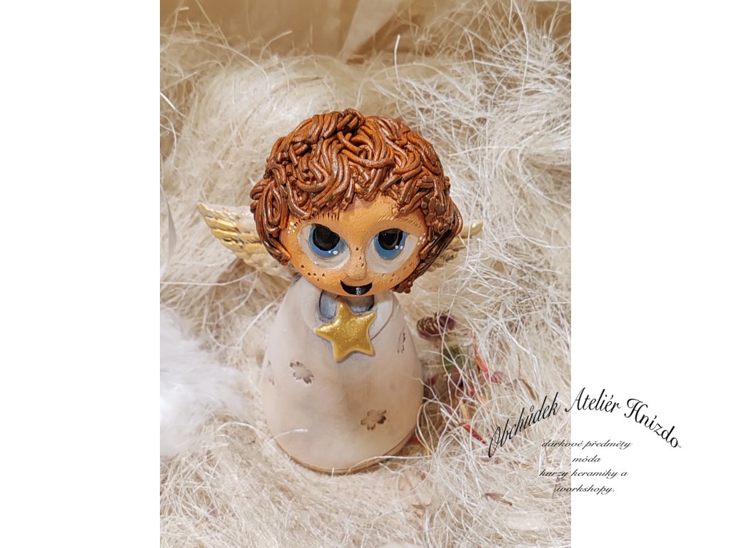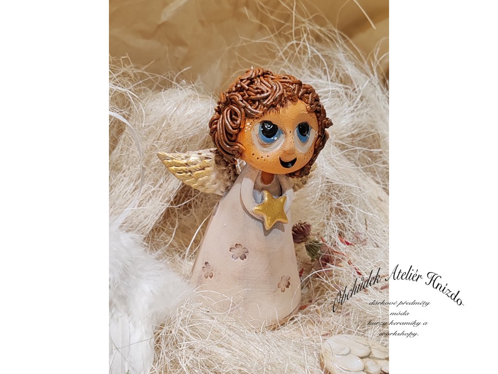 Originální keramický andílek ve tvaru zvonečku z Ateliéru Hnízdo, autorský výrobek Romany Laštovičkové. Každý anděl je jedinečný originál, modelovaný a malovaný ručně s jemnými detaily. Tento andílek s hvězdičkou symbolizuje radost, ochranu a světlo.