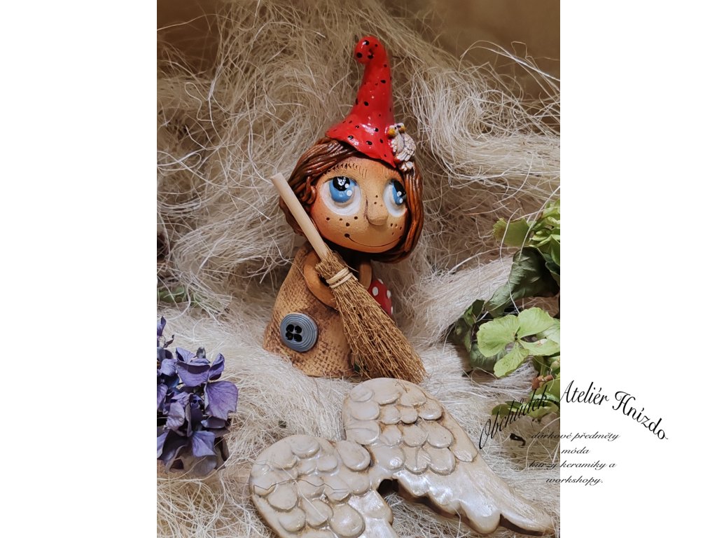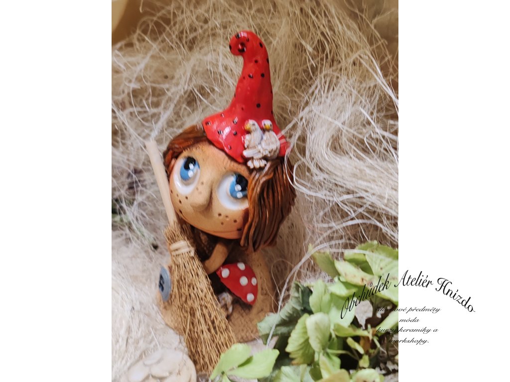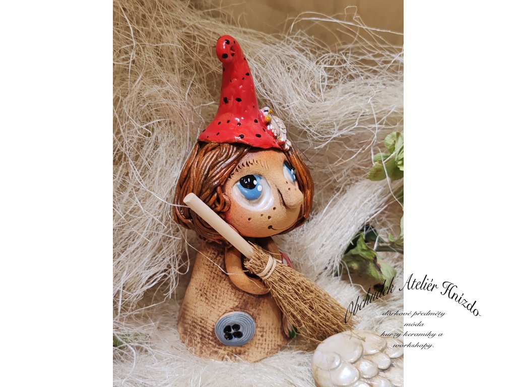 Každá čarodějnice je jedinečný originál – zdobená jemnými detaily, ručně malovaná a s typickým kouzelným výrazem. Tato čarodějnice má sytě červený klobouk se sovičkou, doplněný puntíky jako muchomůrka, a v rukou drží drobné košťátko. Sedí na „pařízku“ s malými houbičkami a knoflíkem – jako by právě vylezla z pohádkového lesa.