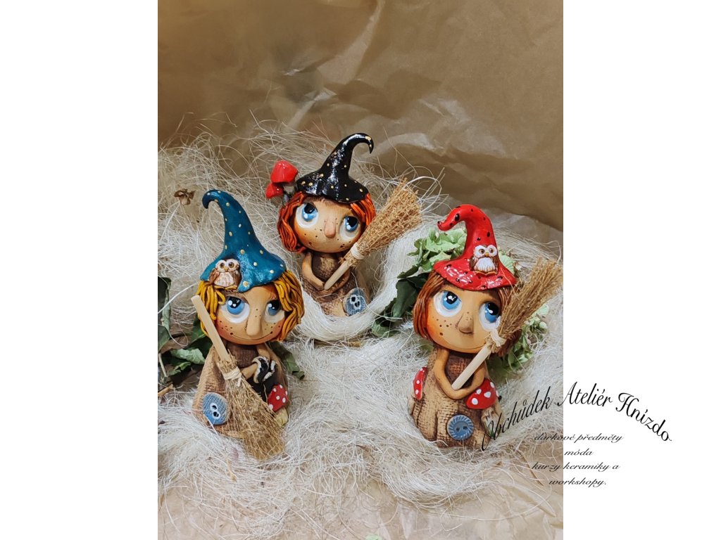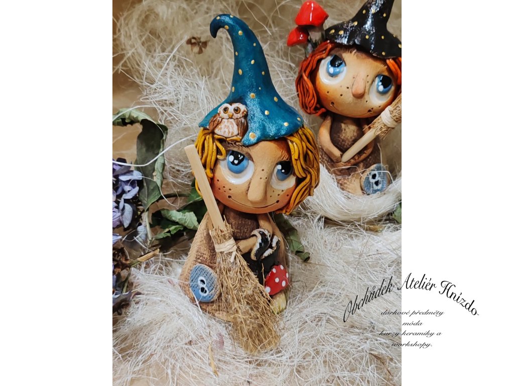 Každá čarodějnice je originál – zdobená jemnými detaily, ručně malovaná a s osobitým pohádkovým výrazem. Tato má modrý klobouk se zlatými puntíky, sovičku na rameni a v ruce malé koště – symbol podzimní magie a klidu lesa.