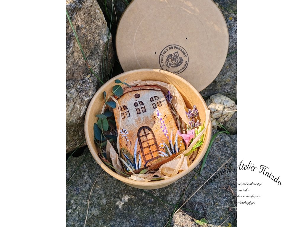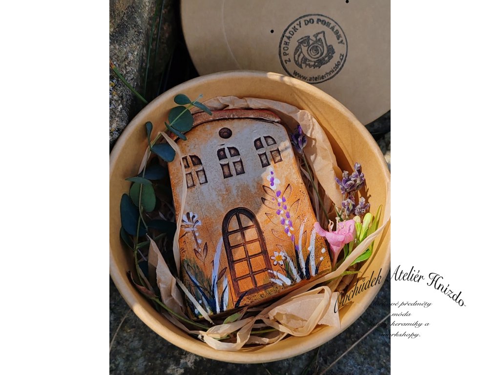Ručně vyráběný keramický domeček od Romany Laštovičkové, uložený v kulaté dárkové krabičce s přírodní výplní a voňavými doplňky. Každý domeček je originál – ručně modelovaný, pálený na vysokou teplotu (1200 °C), dekorovaný glazurami z Roudnice, oxidem železa a domalovaný barvami Darwi. Díky tomu je pevný, odolný a vhodný jak do interiéru, tak i venku – snese déšť i mráz.