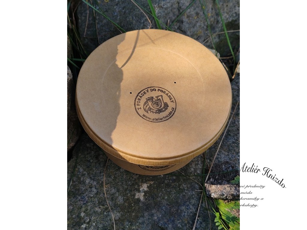 📦 Balení: Kulatá dárková krabička s víčkem a logem, vyplněná přírodní drtí a sušenými květy – připravená k okamžitému darování.