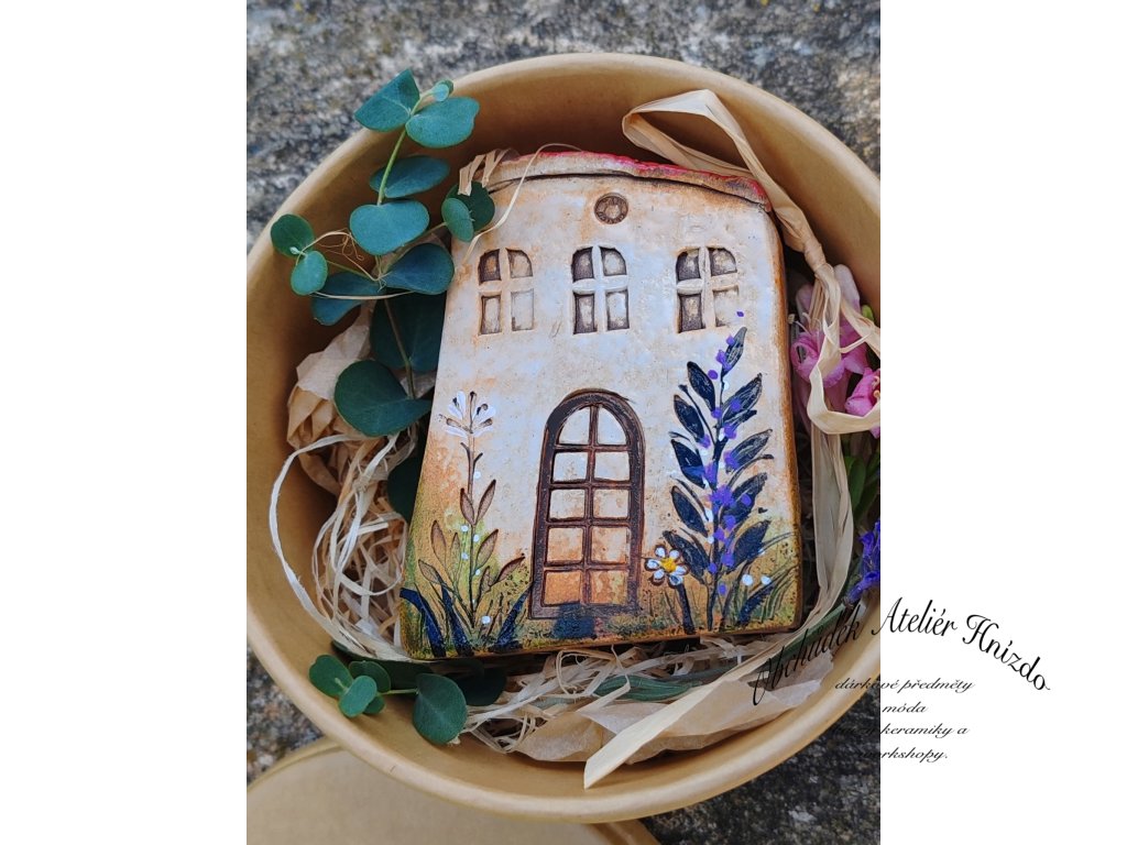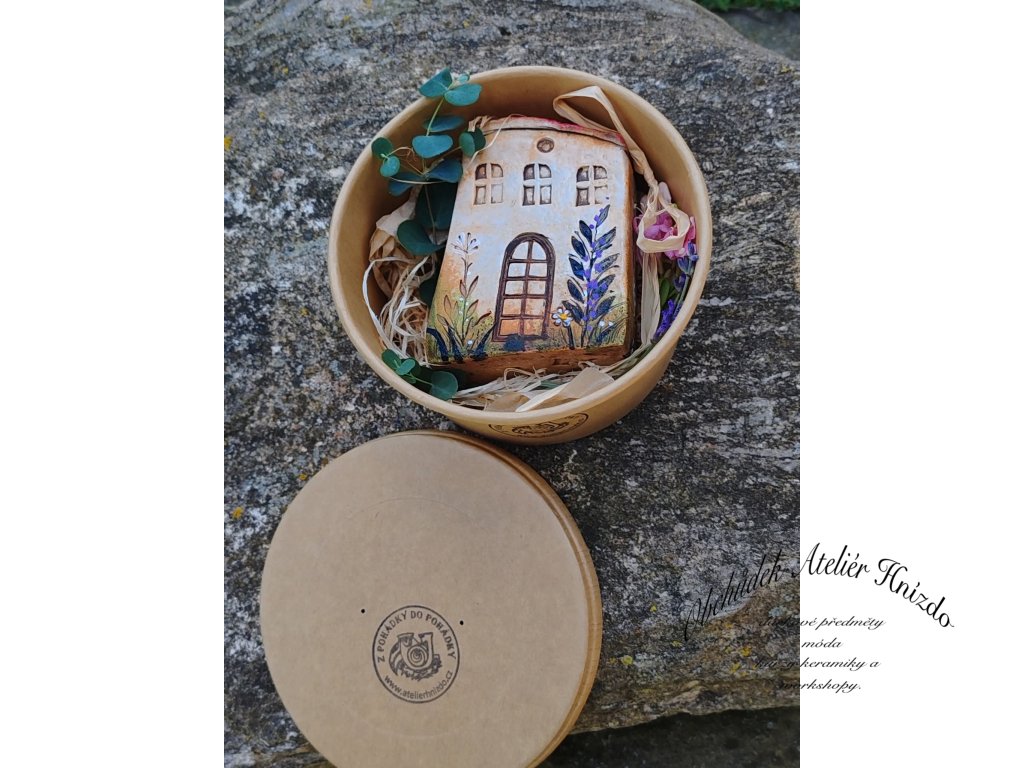 Ručně vyráběný keramický domeček od Romany Laštovičkové, uložený v kulaté dárkové krabičce s přírodní výplní a voňavými doplňky. Každý domeček je originál – ručně modelovaný, pálený na vysokou teplotu (1200 °C), dekorovaný glazurami z Roudnice, oxidem železa a domalovaný barvami Darwi. Díky tomu je pevný, odolný a vhodný jak do interiéru, tak i venku – snese déšť i mráz.