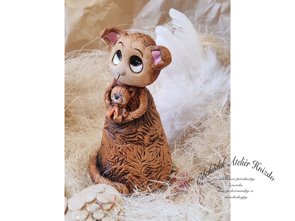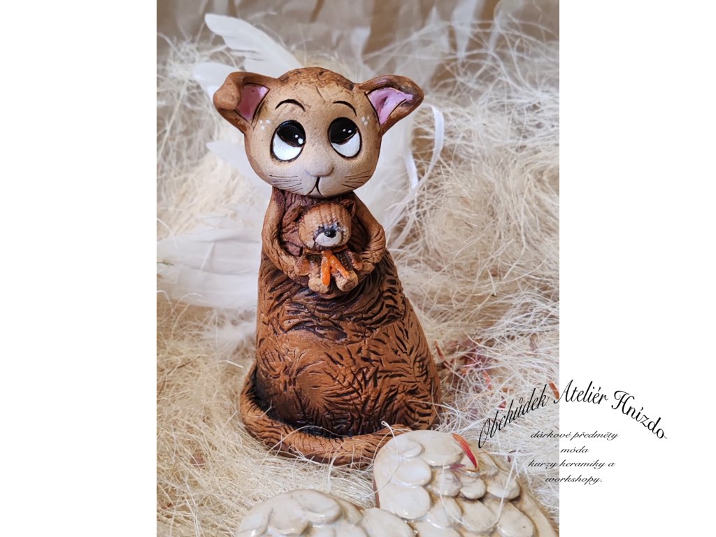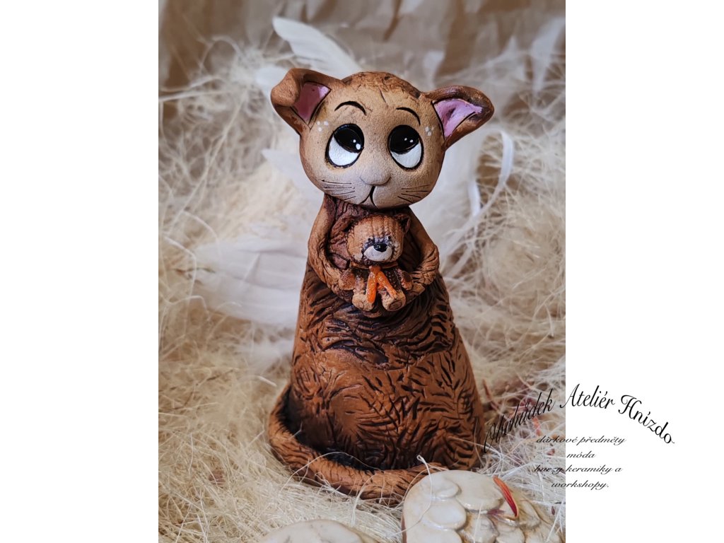Originální keramická figurka kočičky ve tvaru zvonečku z Ateliéru Hnízdo, autorský výrobek Romany Laštovičkové. Roztomilá kočka s velkýma očima v náručí objímá svého plyšového medvídka – symbol něhy, bezpečí a hravosti. Každá kočička je ručně modelovaná, proto je vždy jedinečná a originální.