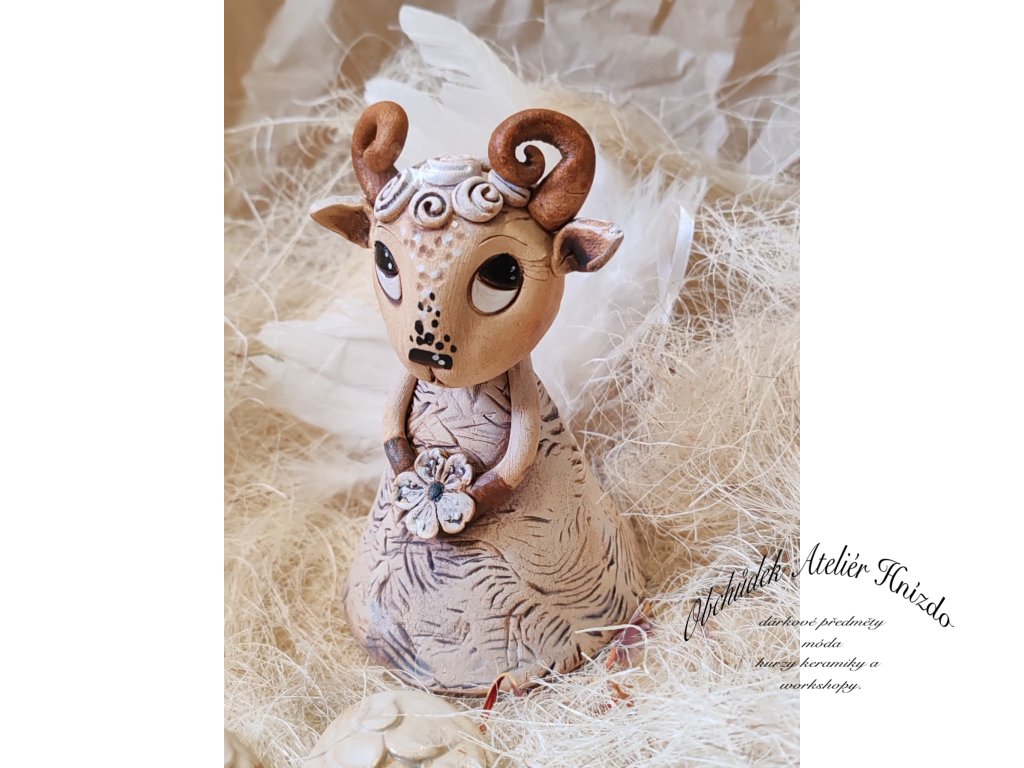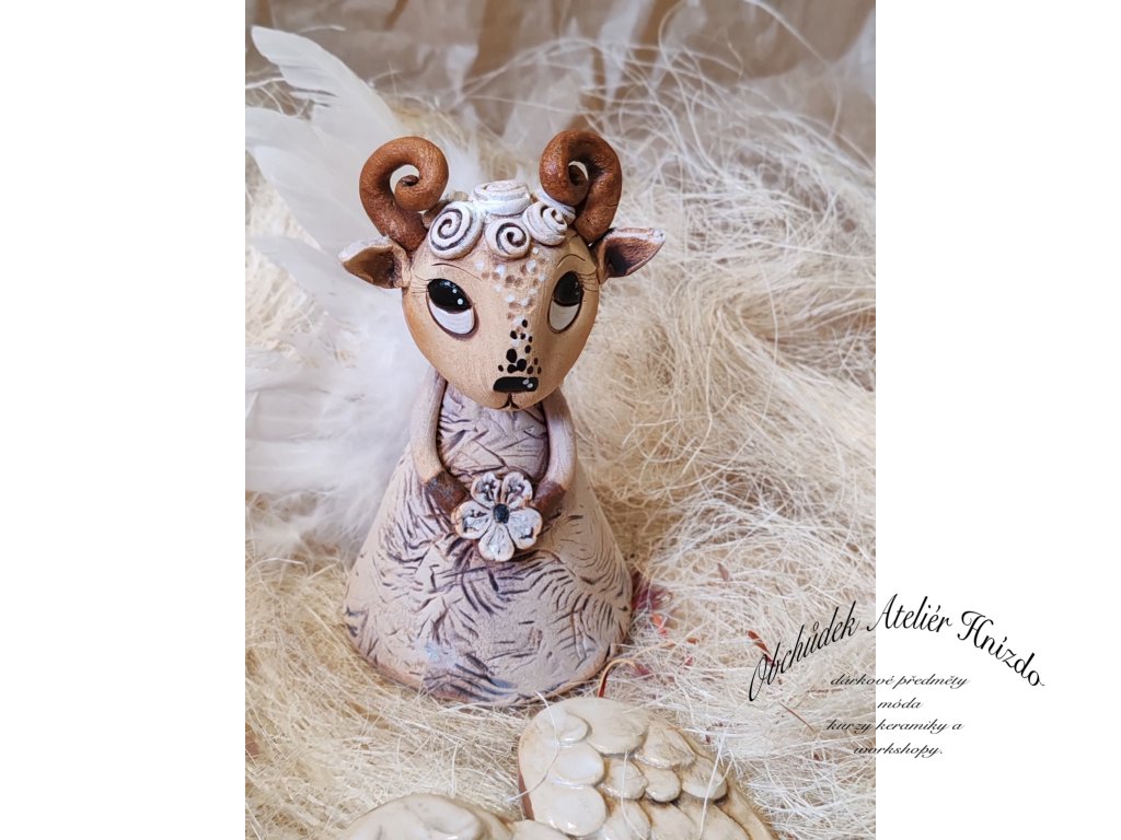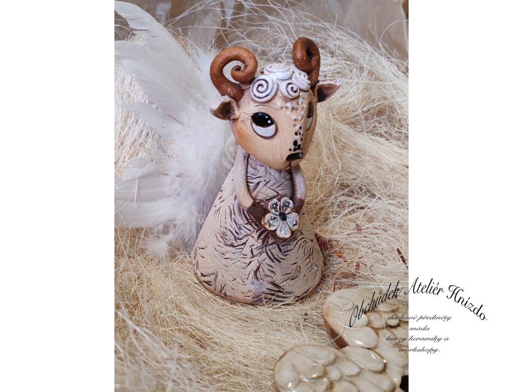 Originální keramická ovečka ve tvaru zvonečku z Ateliéru Hnízdo, autorský výrobek Romany Laštovičkové. Ručně modelovaná figurka s rohy, květinovým detailem a jemně zdobeným šatem působí kouzelně a zároveň hravě. Každý kus je jedinečný originál, nikdy nevznikají dva stejní.