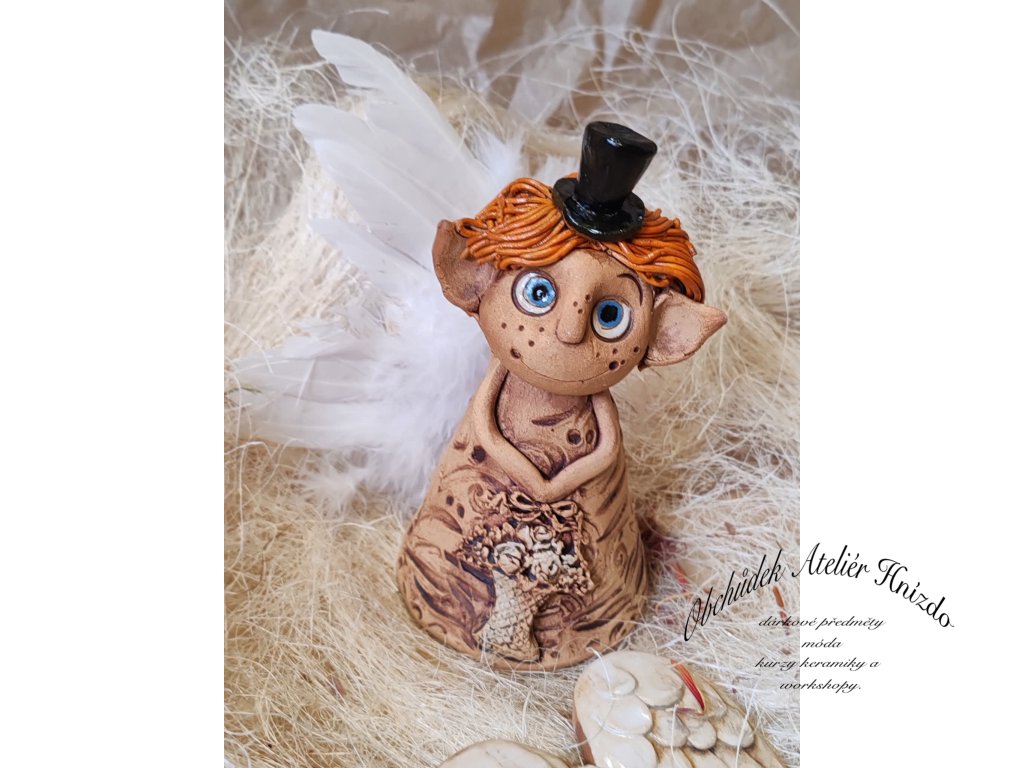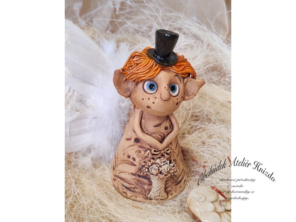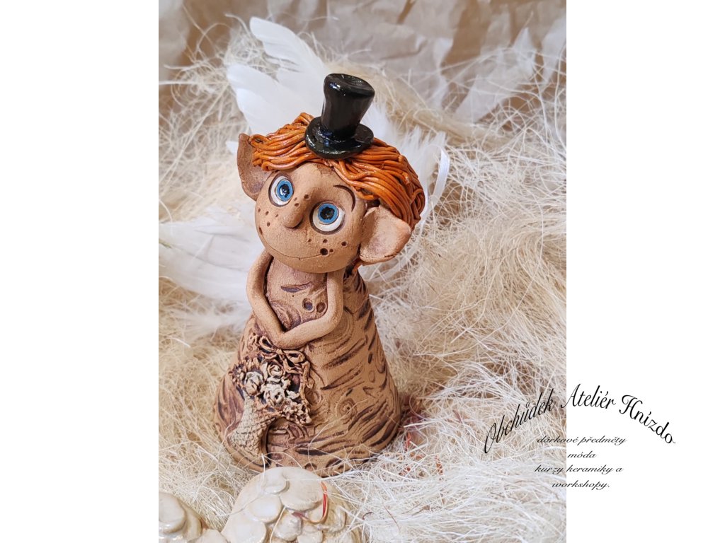 Originální keramický skřítek ve tvaru zvonečku z Ateliéru Hnízdo, autorský výrobek Romany Laštovičkové. Ručně modelovaná postavička s veselýma očima, pihami a černým kloboučkem působí pohádkově a hravě. Na šatech nese kytici květin, která podtrhuje kouzelný charakter figurky. Každý skřítek je jedinečný originál – nikdy nevznikají dva stejní.